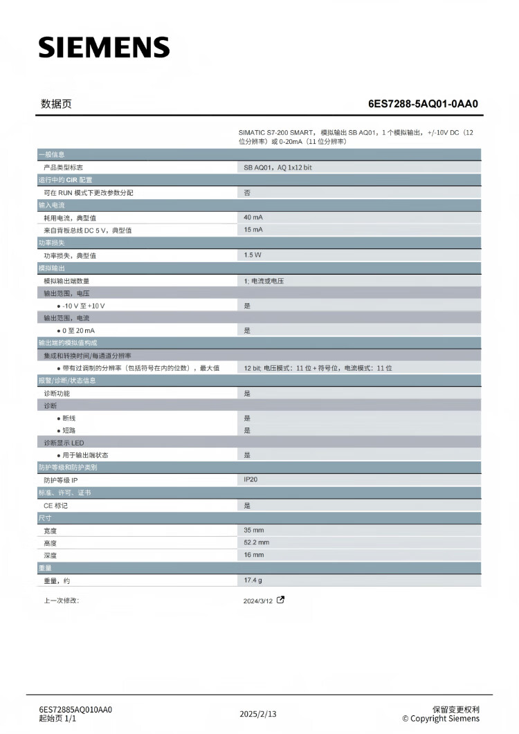 Siemens 6ES72885AQ010AA0 PLC module controller SIMATIC S7-200 SMART, analog output SB AQ01, 1 analog output,