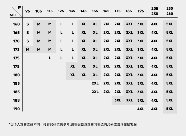 China (cm) 160-165/84-86 165-170 / 88-90 167-172 / 92-96 168-173 / 98-102 170-176 / 106-110