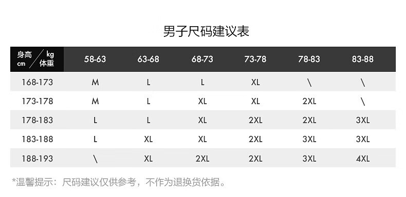 China (cm) 165 / 88-90 170 / 96-98 175 / 108-110 180 / 118-122 185 / 126-130