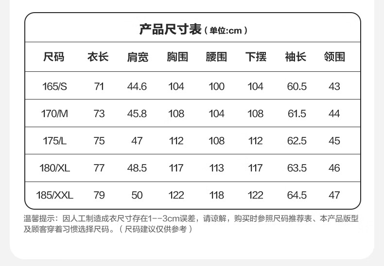 China (cm) 165 / 88-90 170 / 96-98 175 / 108-110 180 / 118-122 185 / 126-130
