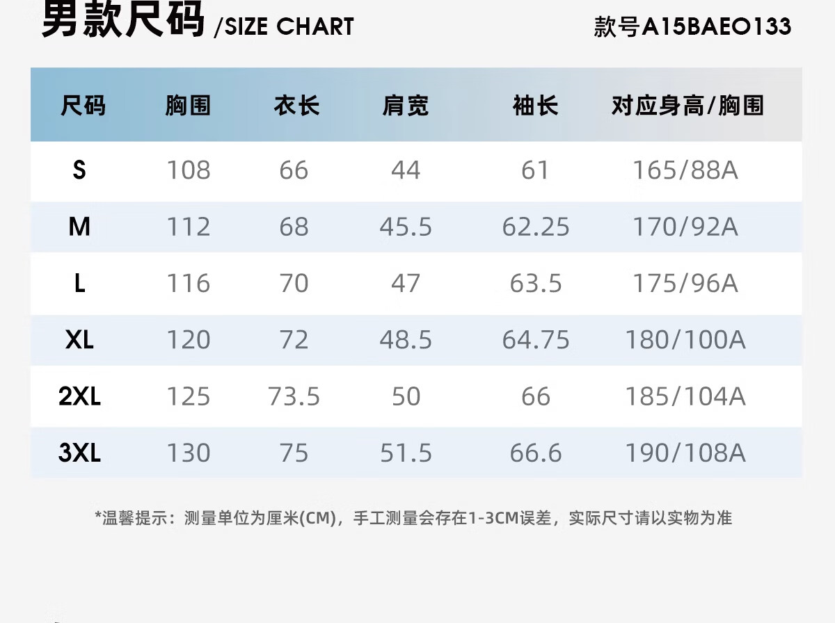 China (cm) 165 / 88-90 170 / 96-98 175 / 108-110 180 / 118-122 185 / 126-130