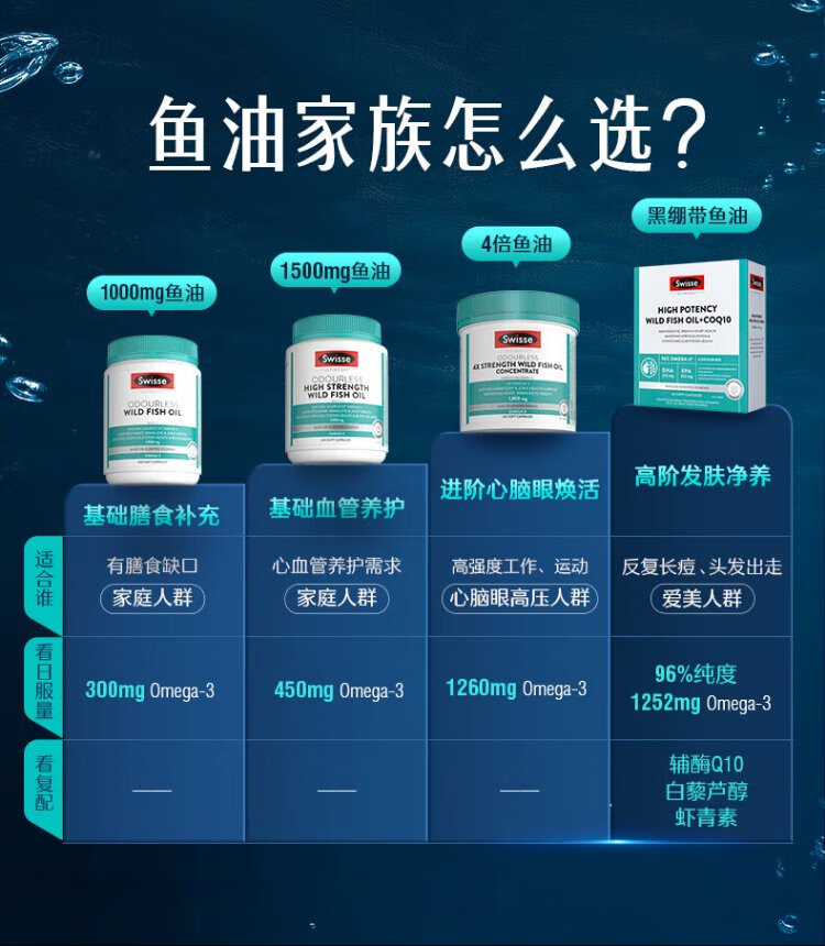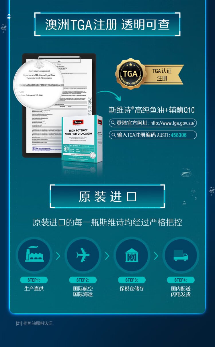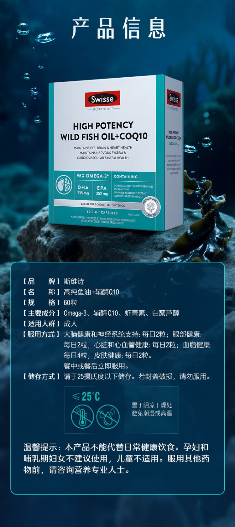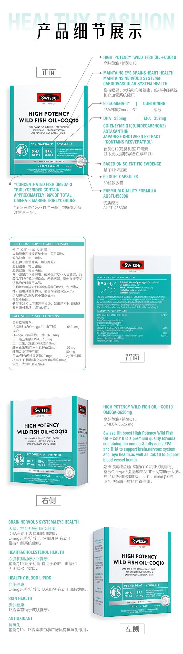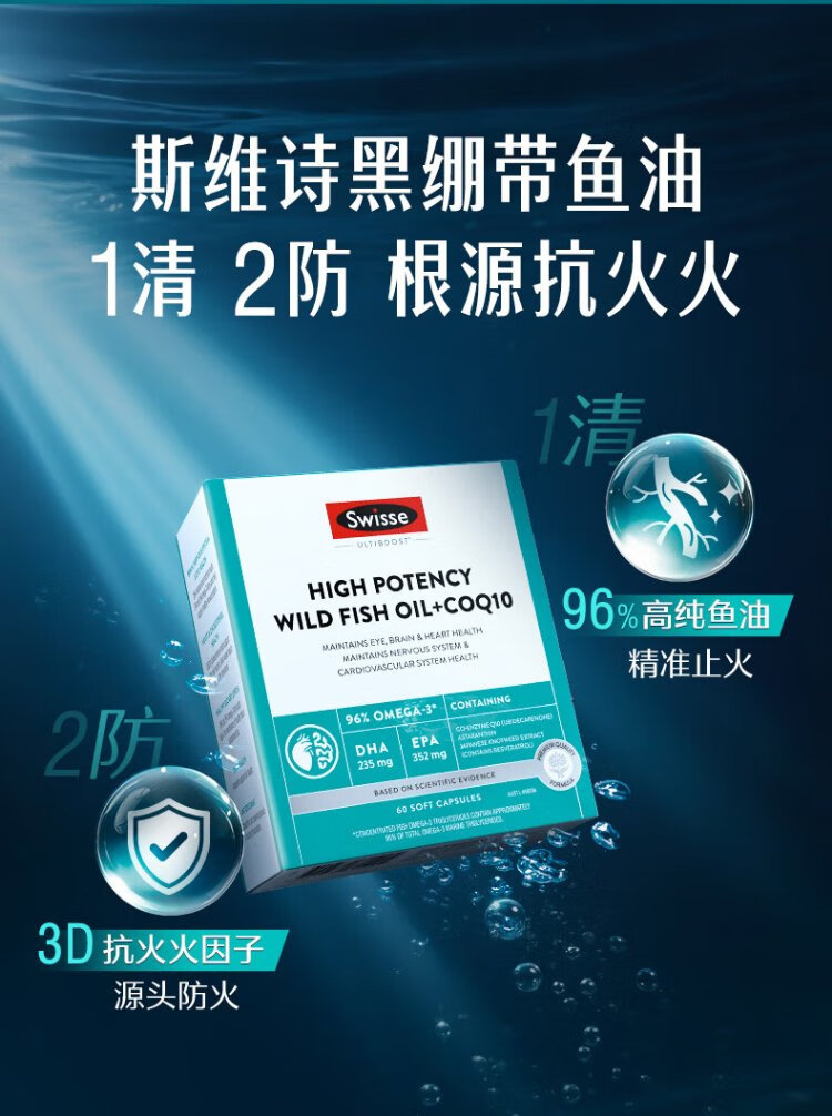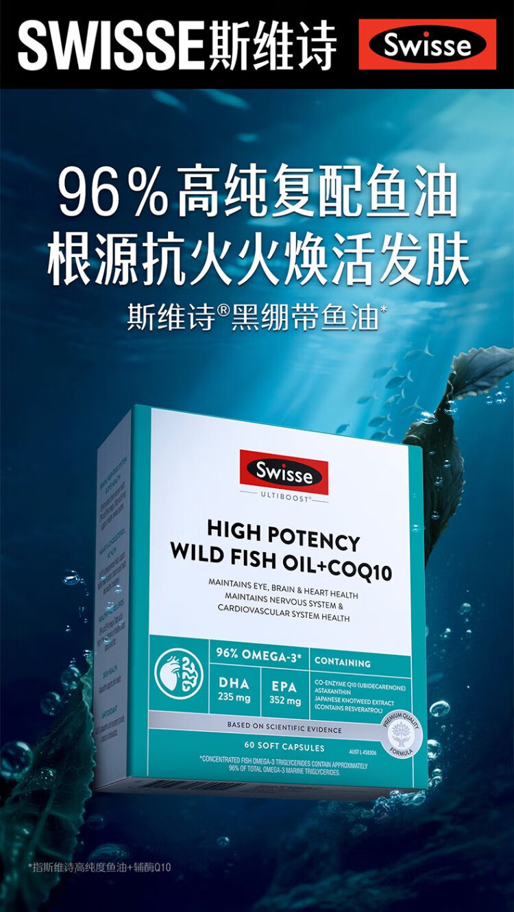 Swisse 96% High Purity Deep Sea Fish Oil Coenzyme Q10 Soft Capsules Black Bandage Fish Oil 60 capsules Omega-3