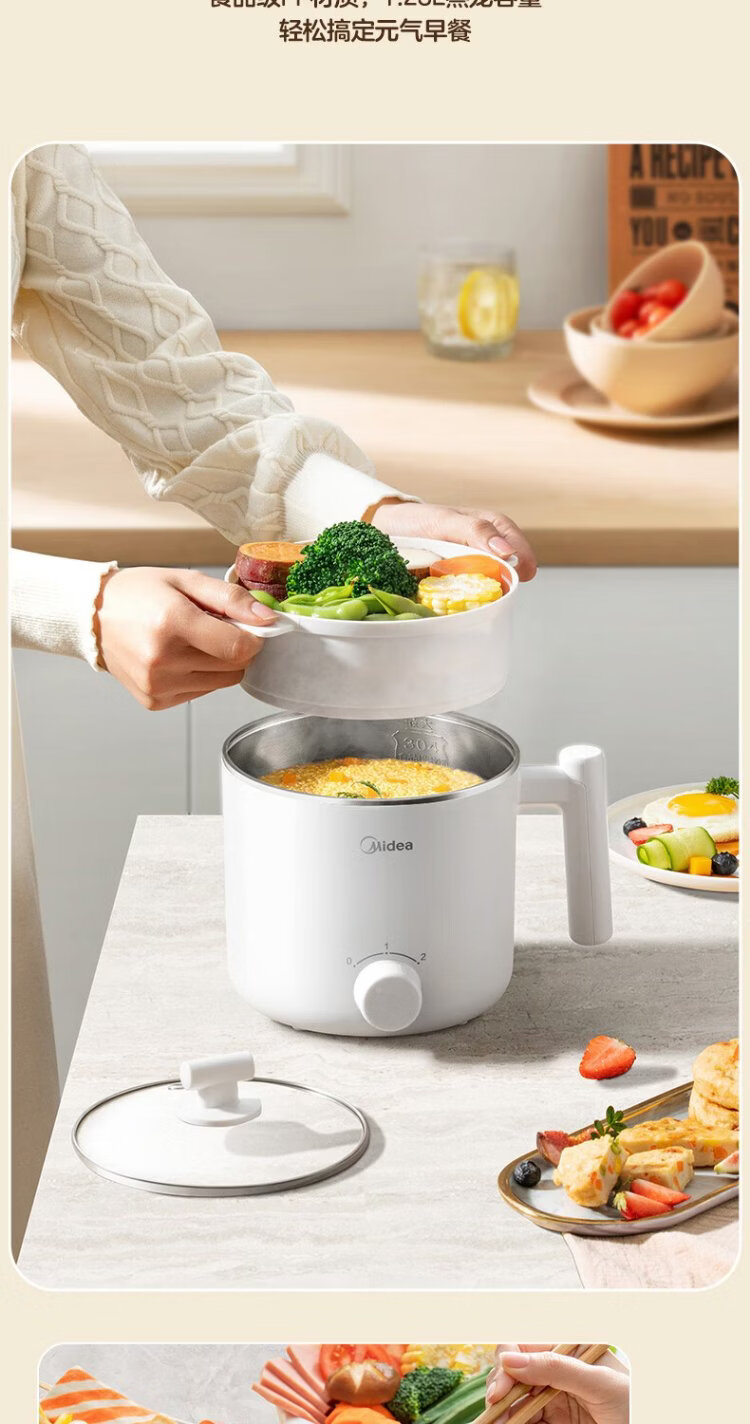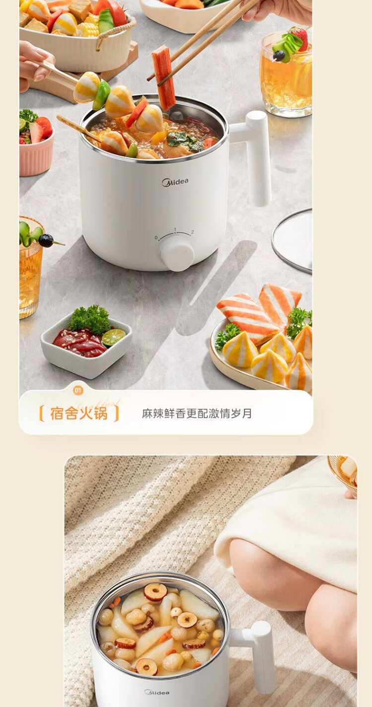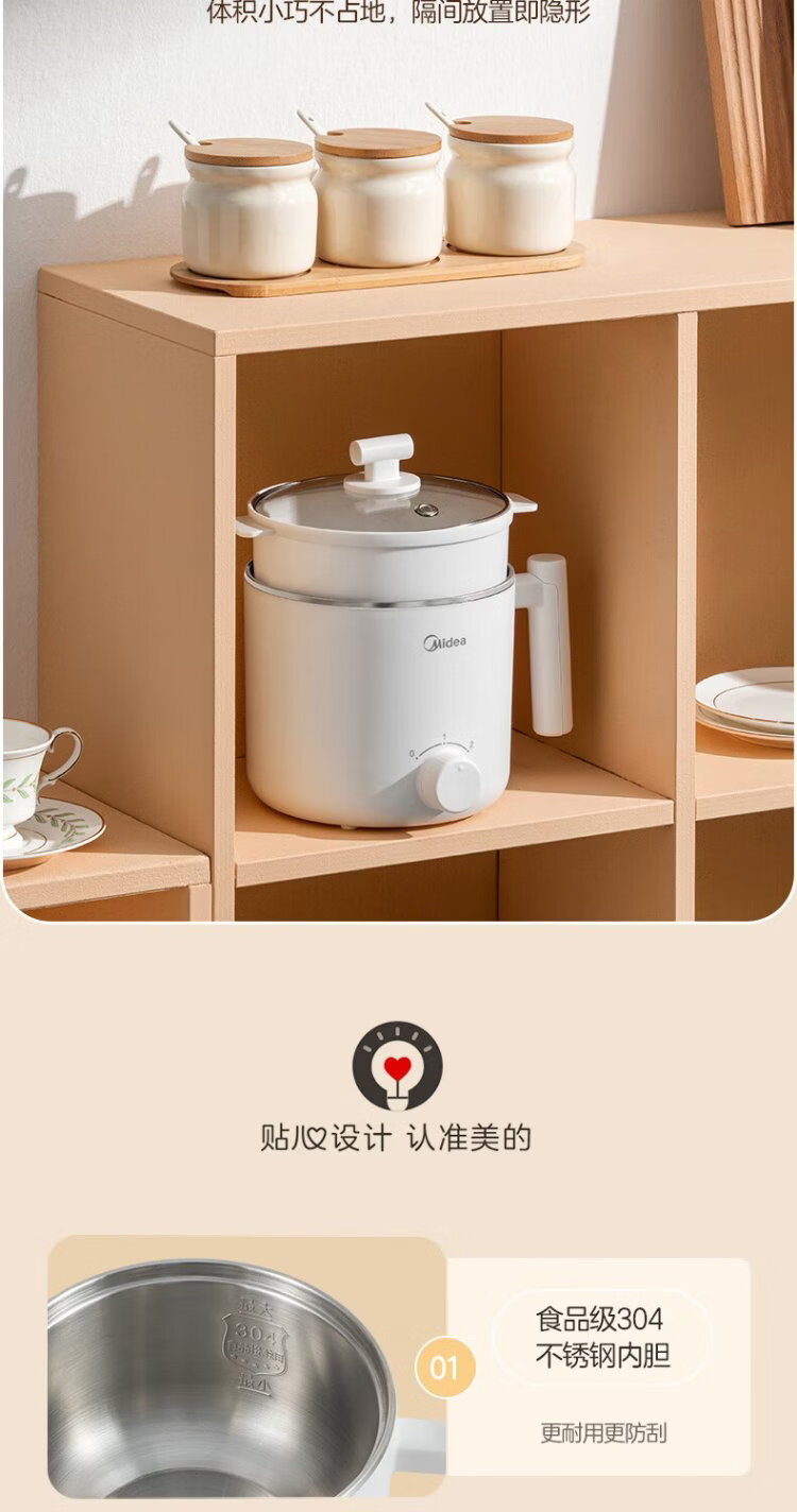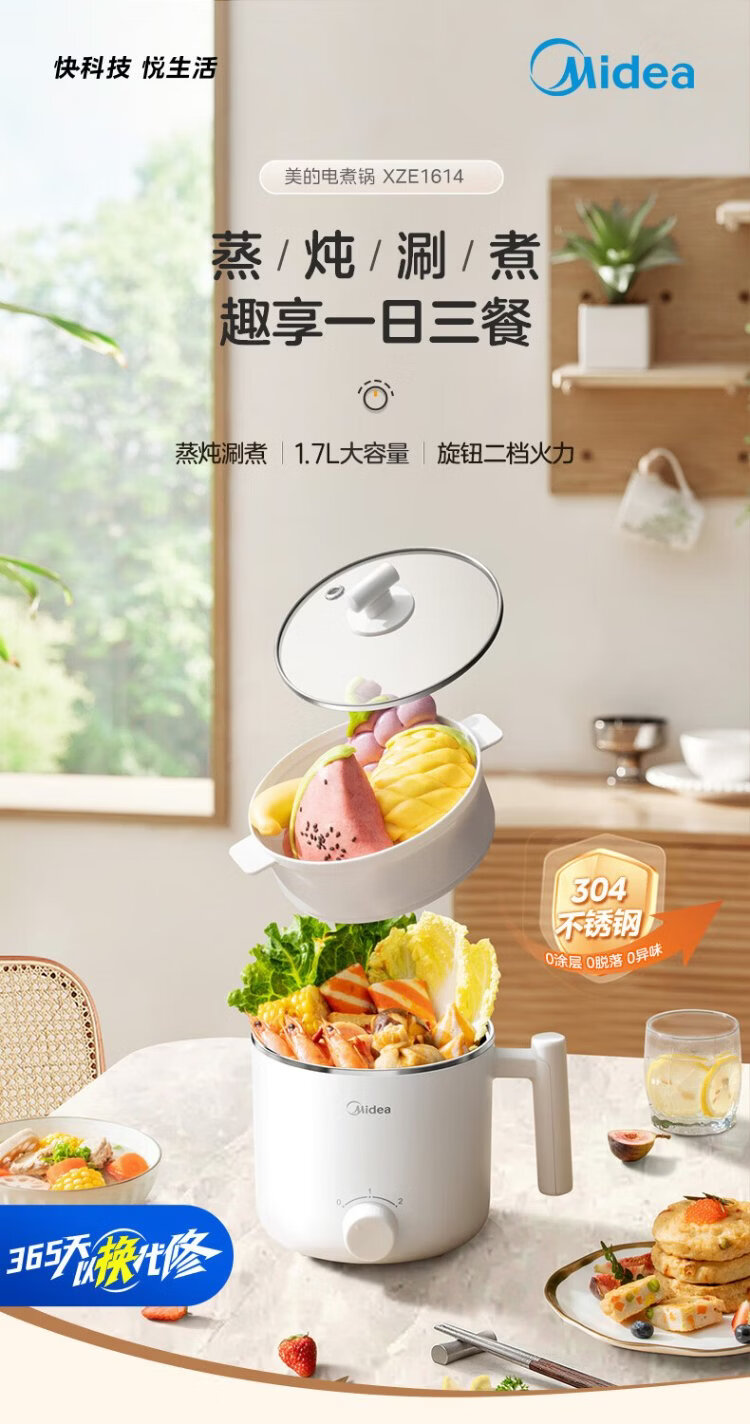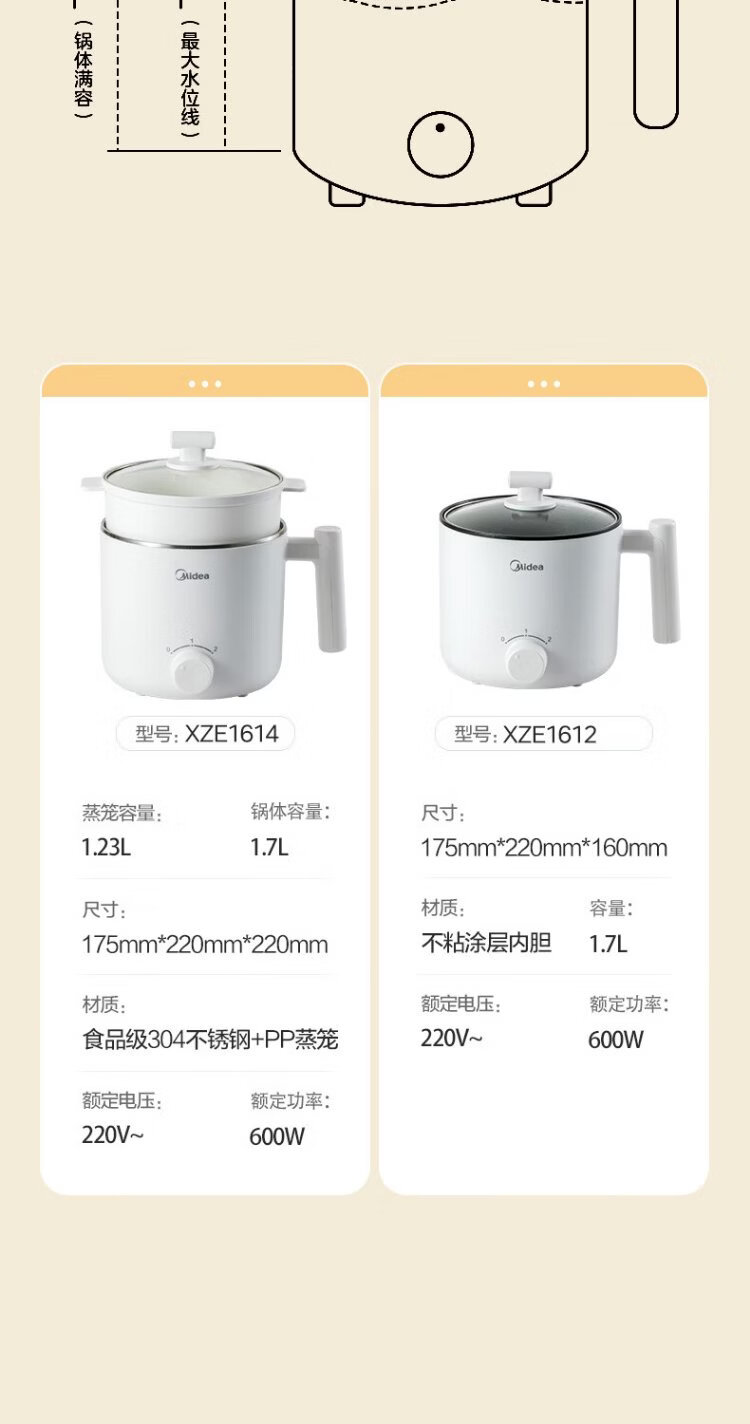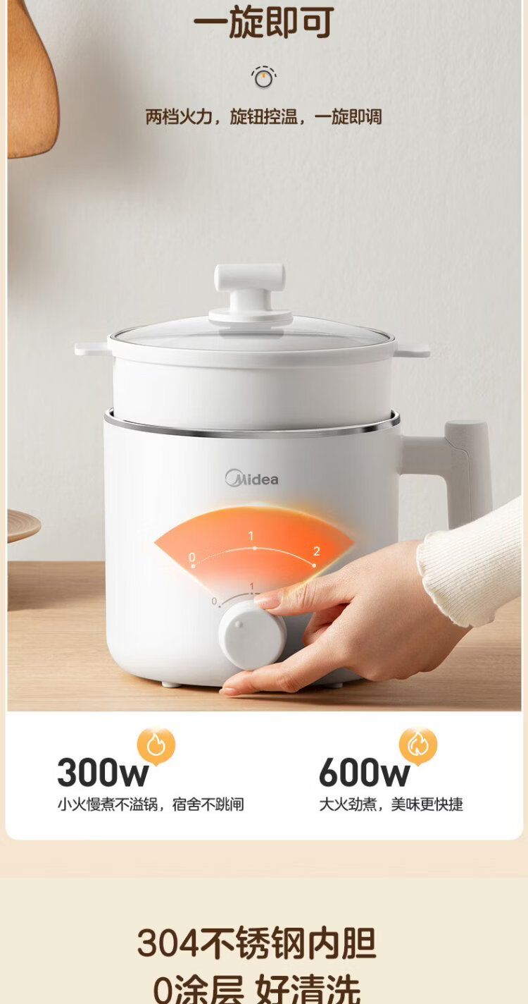 Midea electric cooker dormitory small pot small electric pot student dormitory all-in-one instant noodle hot pot multi-function stainless steel 0 coating electric steamer electric hot pot XZE1614 with steamer