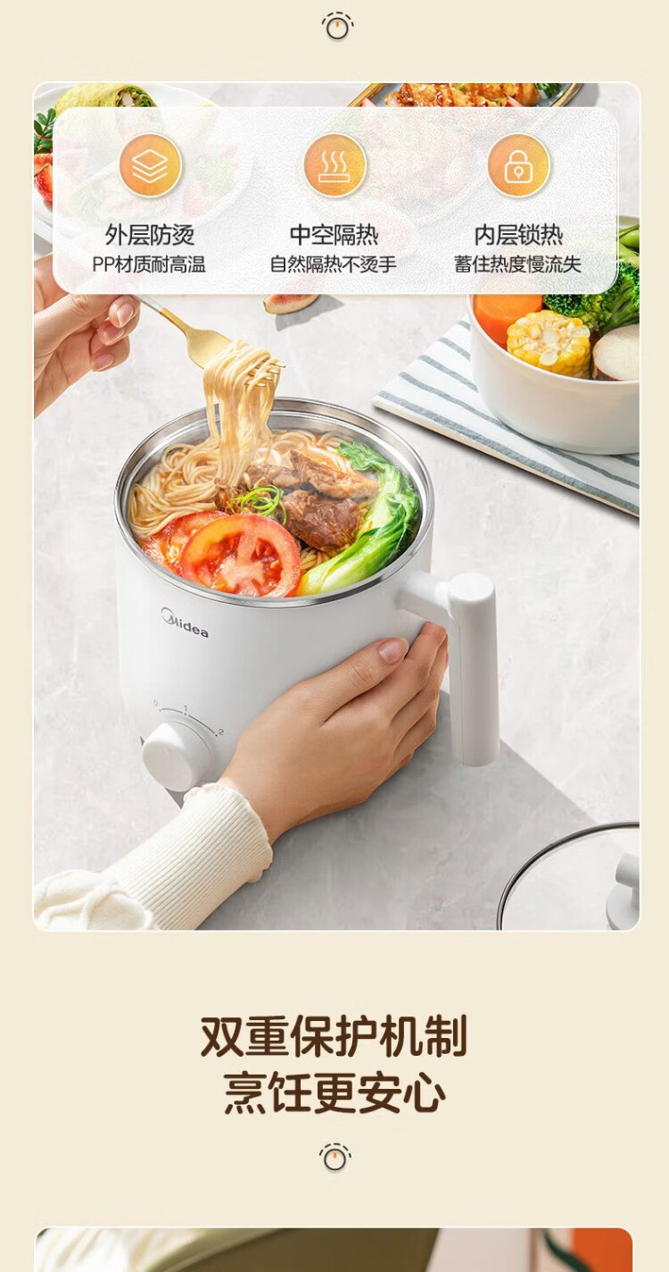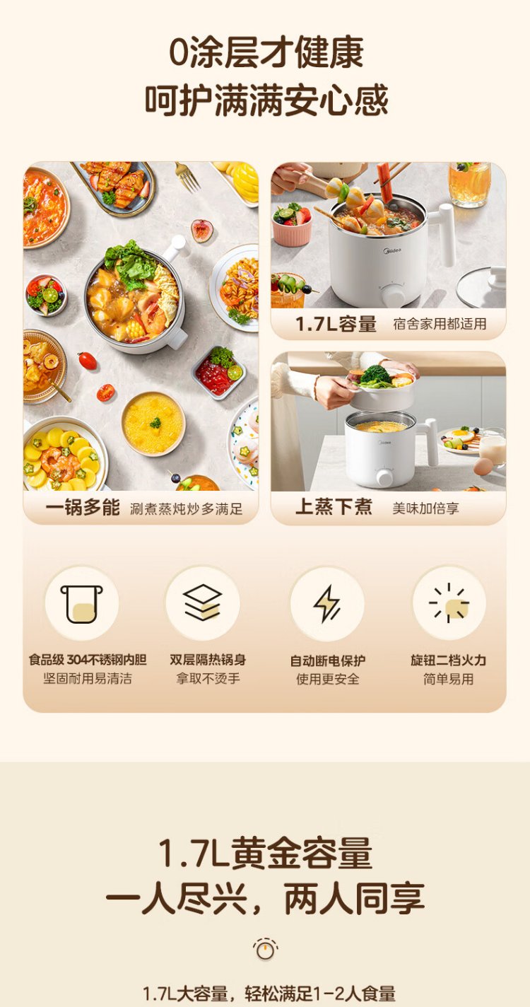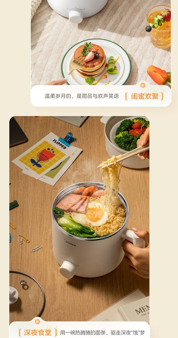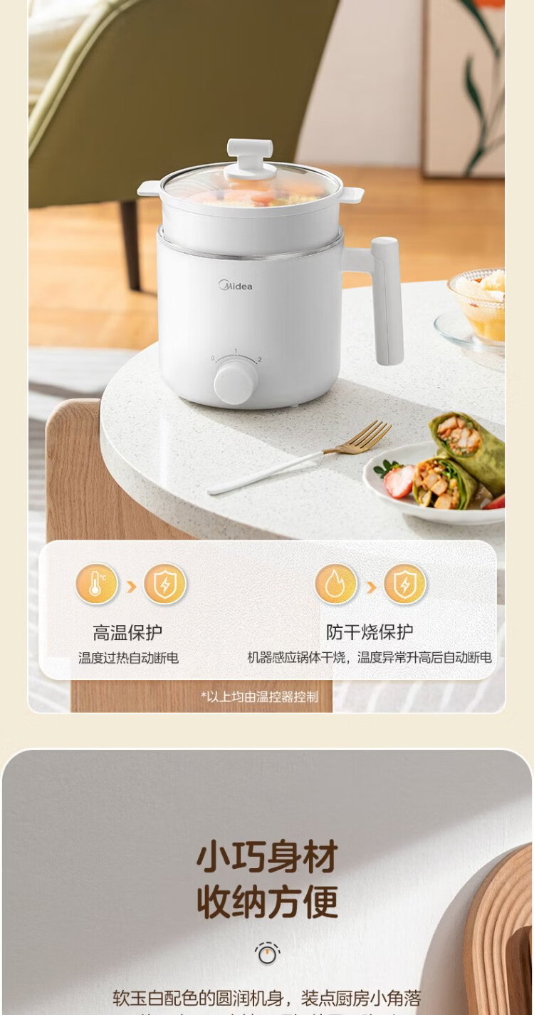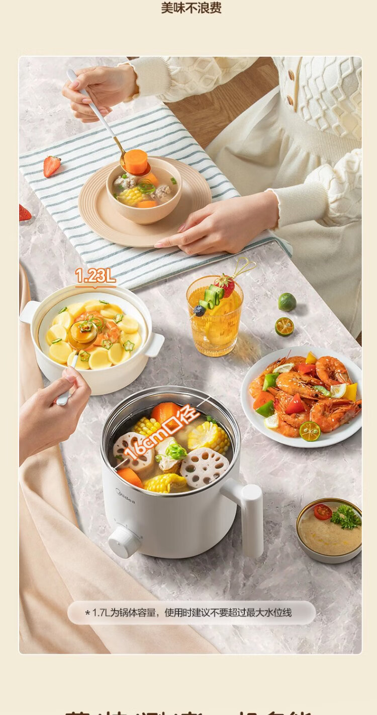 Midea electric cooker dormitory small pot small electric pot student dormitory all-in-one instant noodle hot pot multi-function stainless steel 0 coating electric steamer electric hot pot XZE1614 with steamer