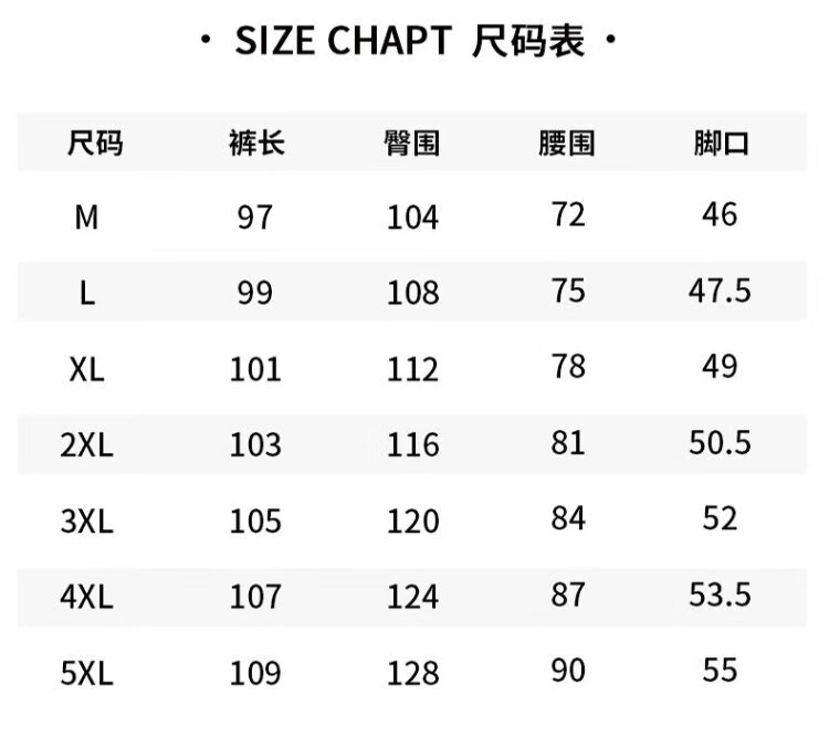 Outseam (cm) 99 cm 101.5 cm 104 cm 106.5 cm 109 cm