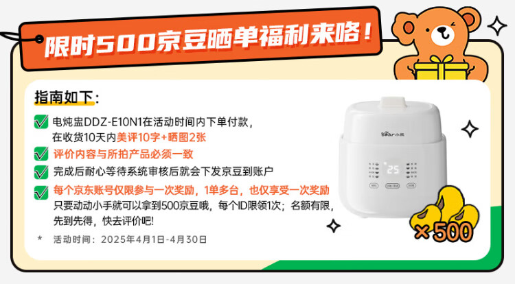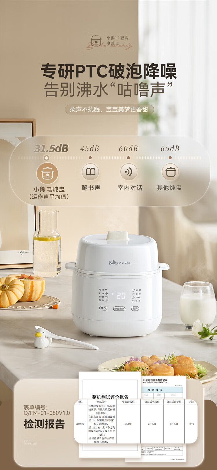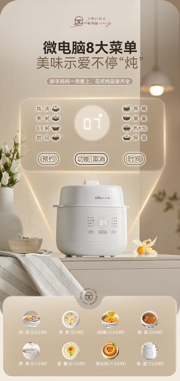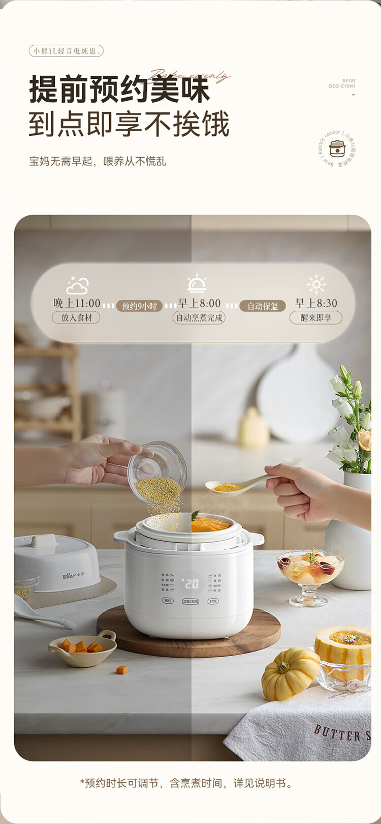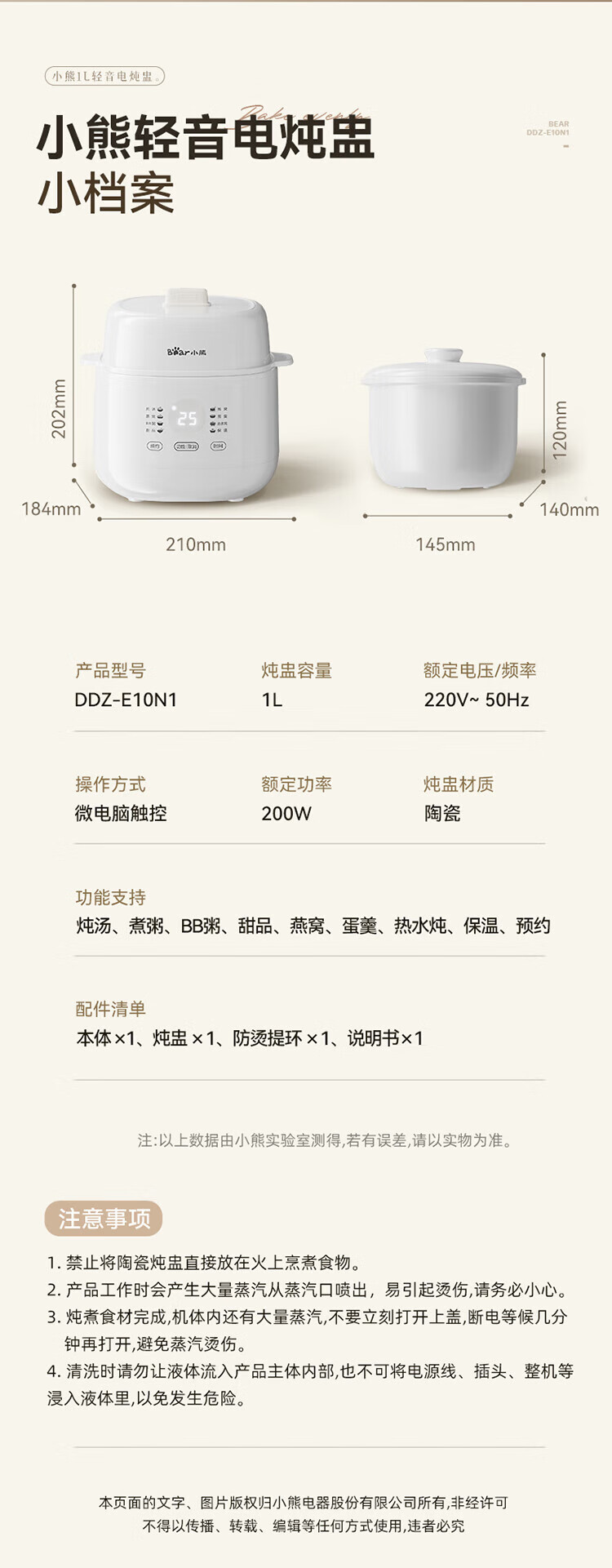 Bear electric stew pot, electric stew pot, soup pot, electric stew pot, baby food pot, porridge pot, bird's nest stew pot, water-proof stew pot, 1-2 people soup pot, 1L soup pot DDZ-E10N1