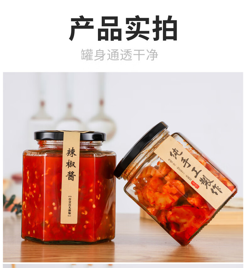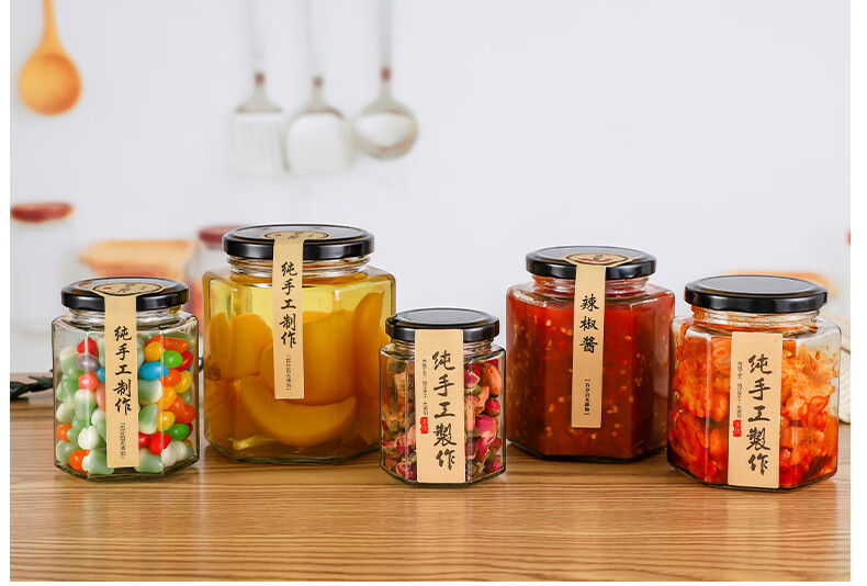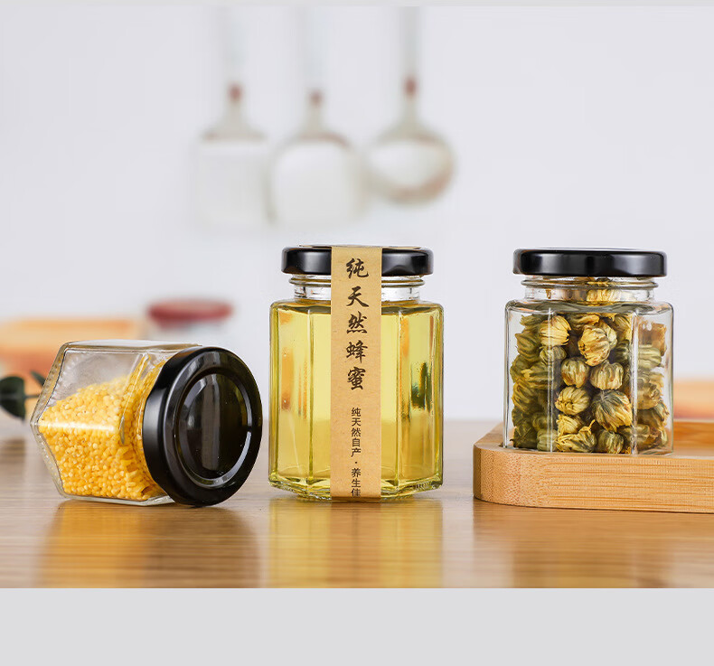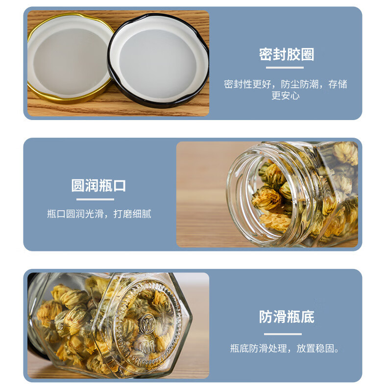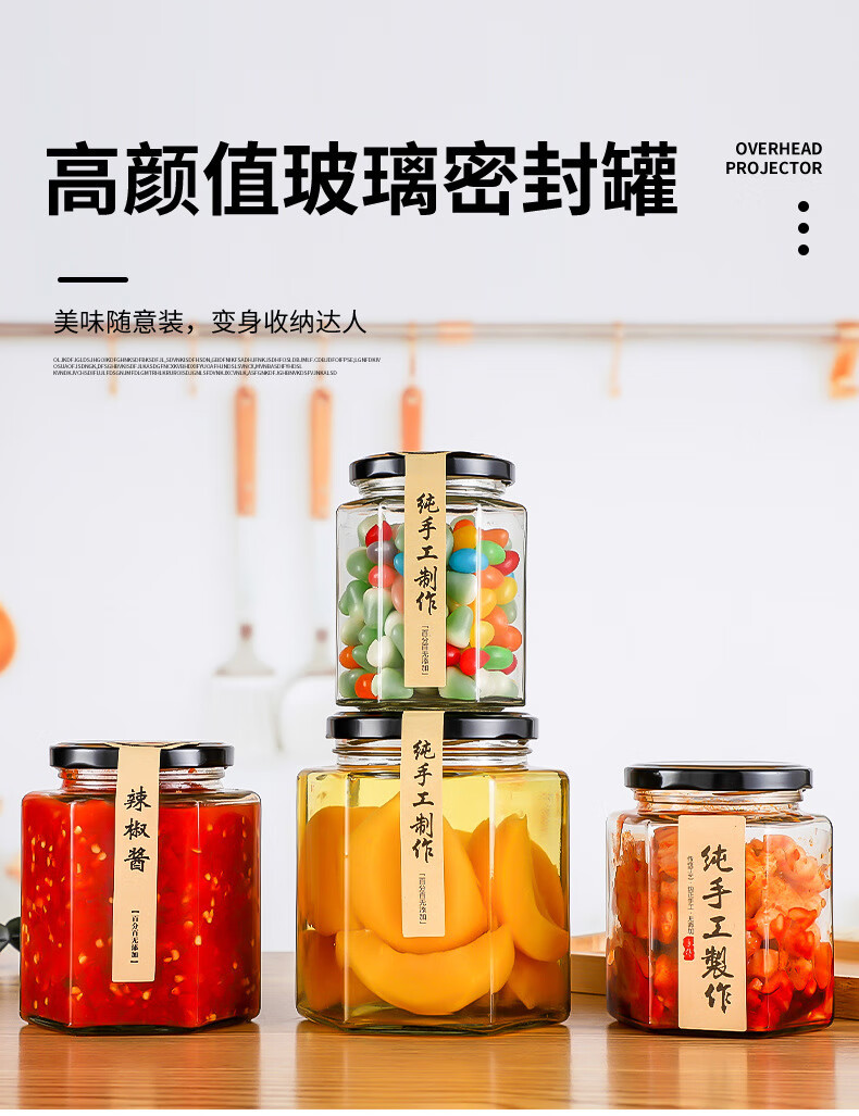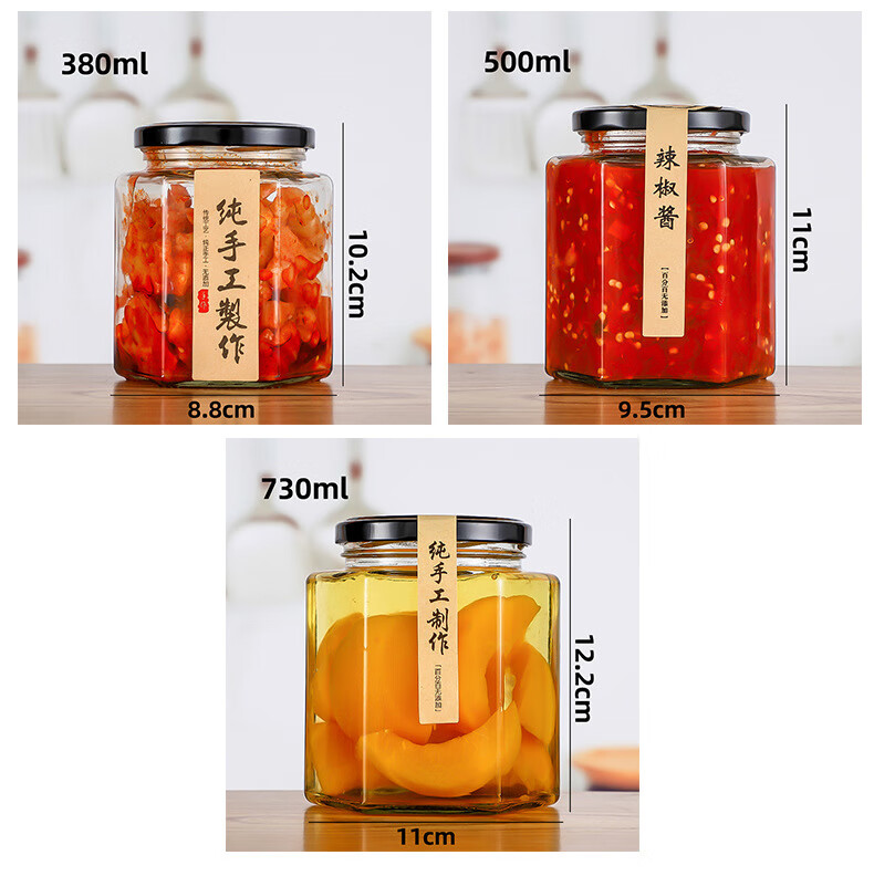 PINYU glass jar with lid, food grade hexagonal jam, chili sauce sealed jar, honey lemon paste, grains and dry goods storage jar
