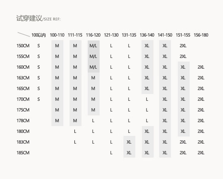 China (cm) 160-165/84-86 165-170 / 88-90 167-172 / 92-96 168-173 / 98-102 170-176 / 106-110