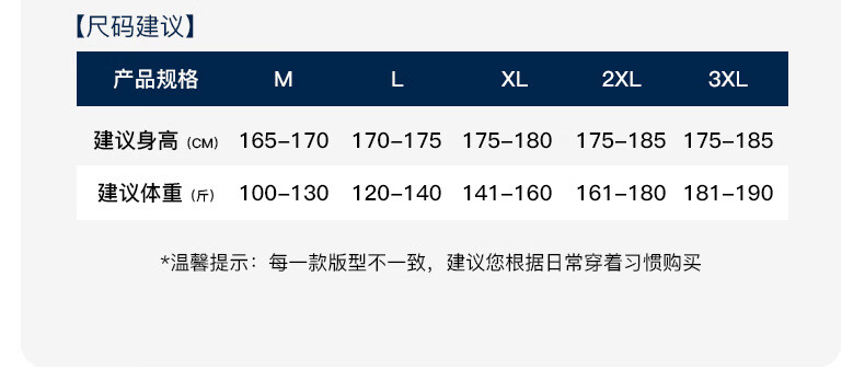 China (cm) 165 / 88-90 170 / 96-98 175 / 108-110 180 / 118-122 185 / 126-130
