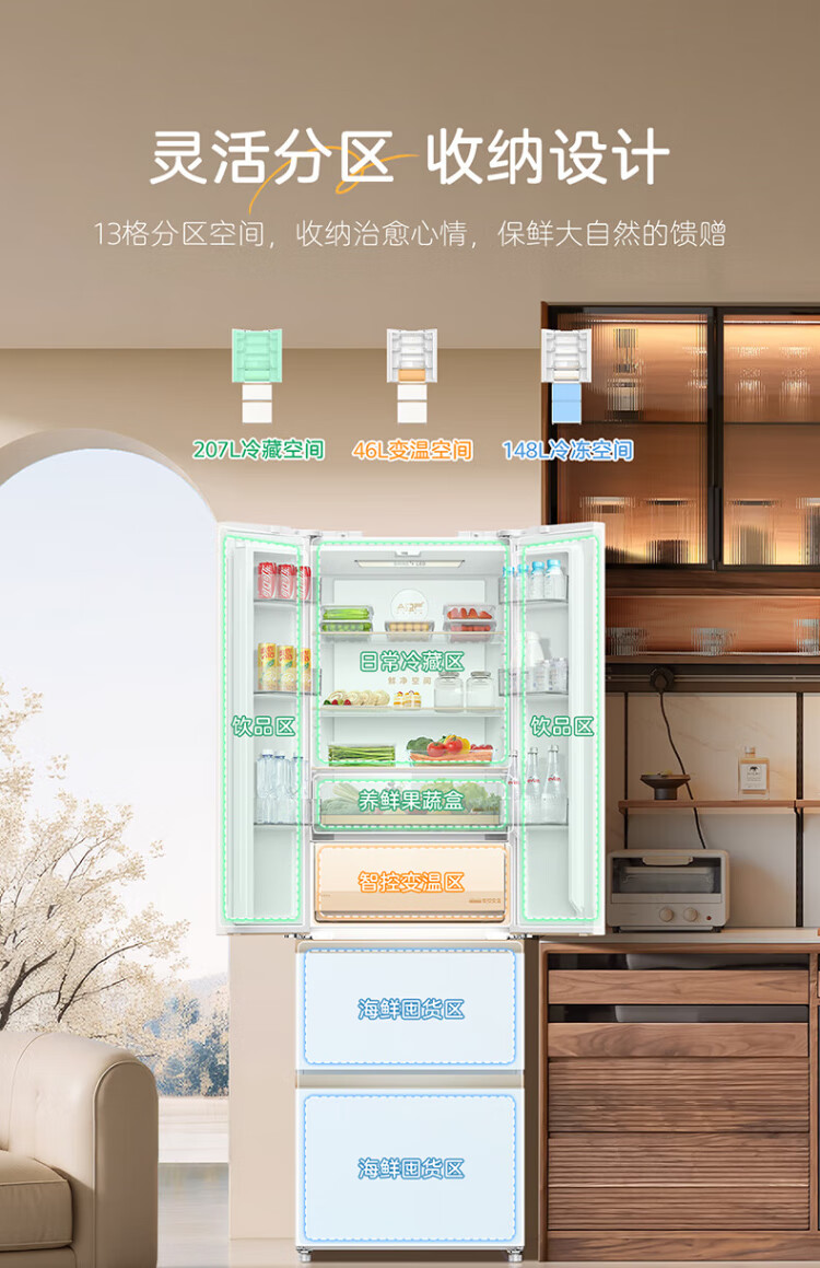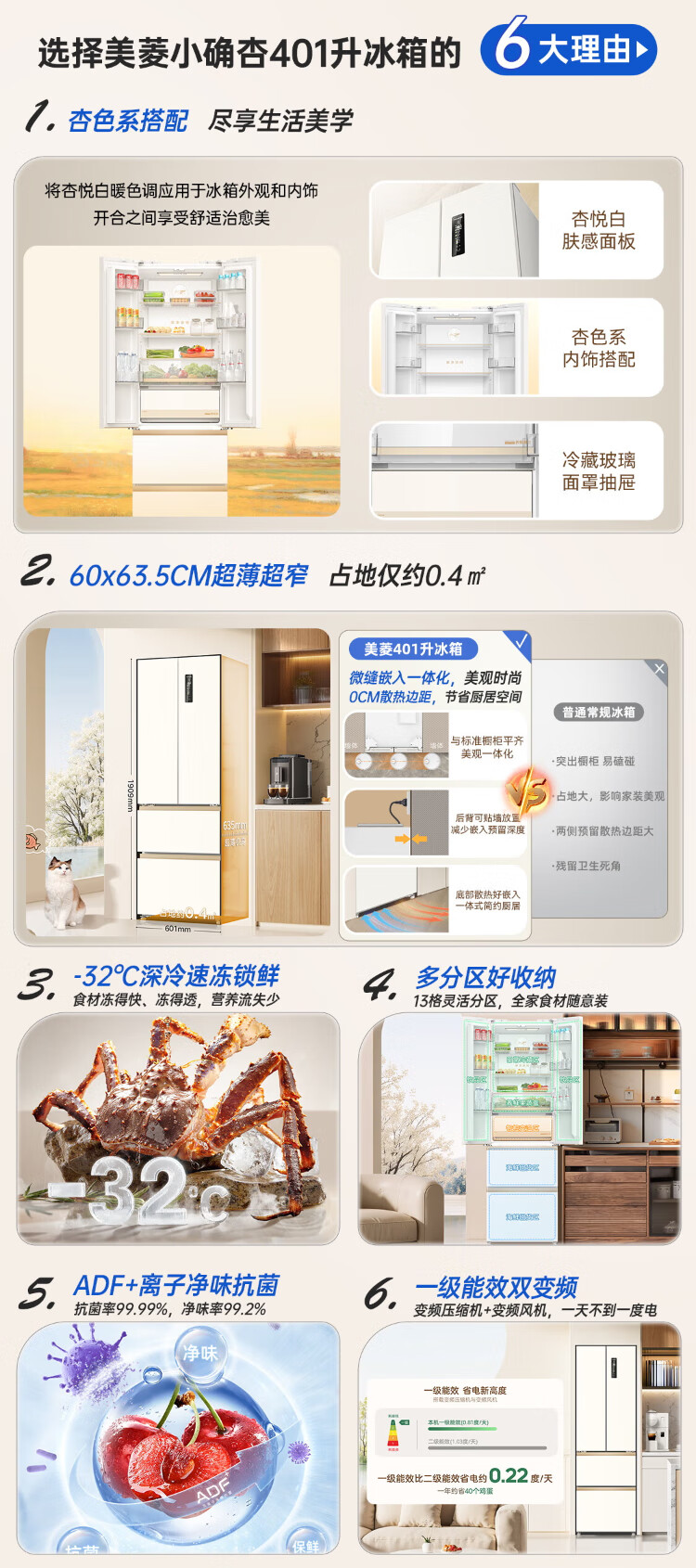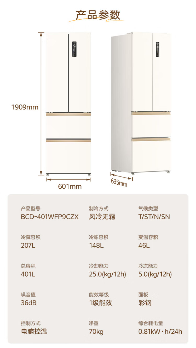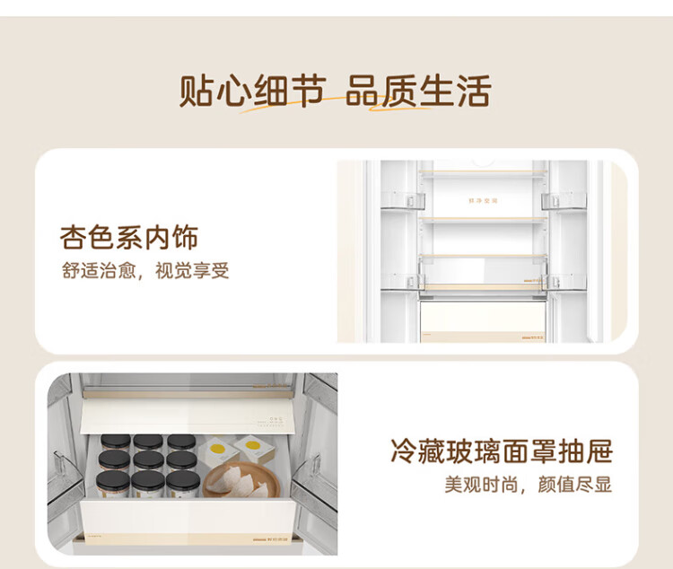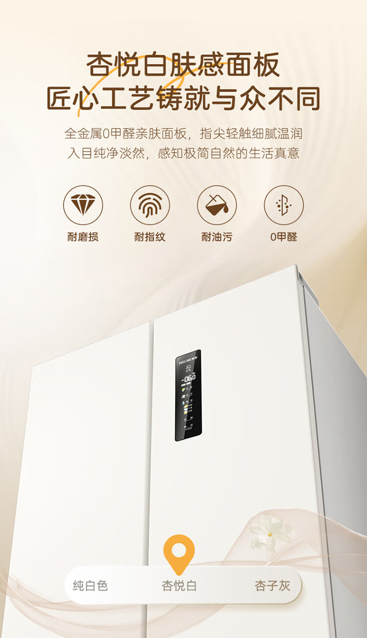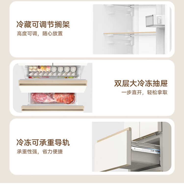 MeiLing small apricot 401 liter French refrigerator small household bottom cooling 60cm wide ultra-thin narrow door embedded air cooling national subsidy BCD-401WFP9CZX Xingyue White