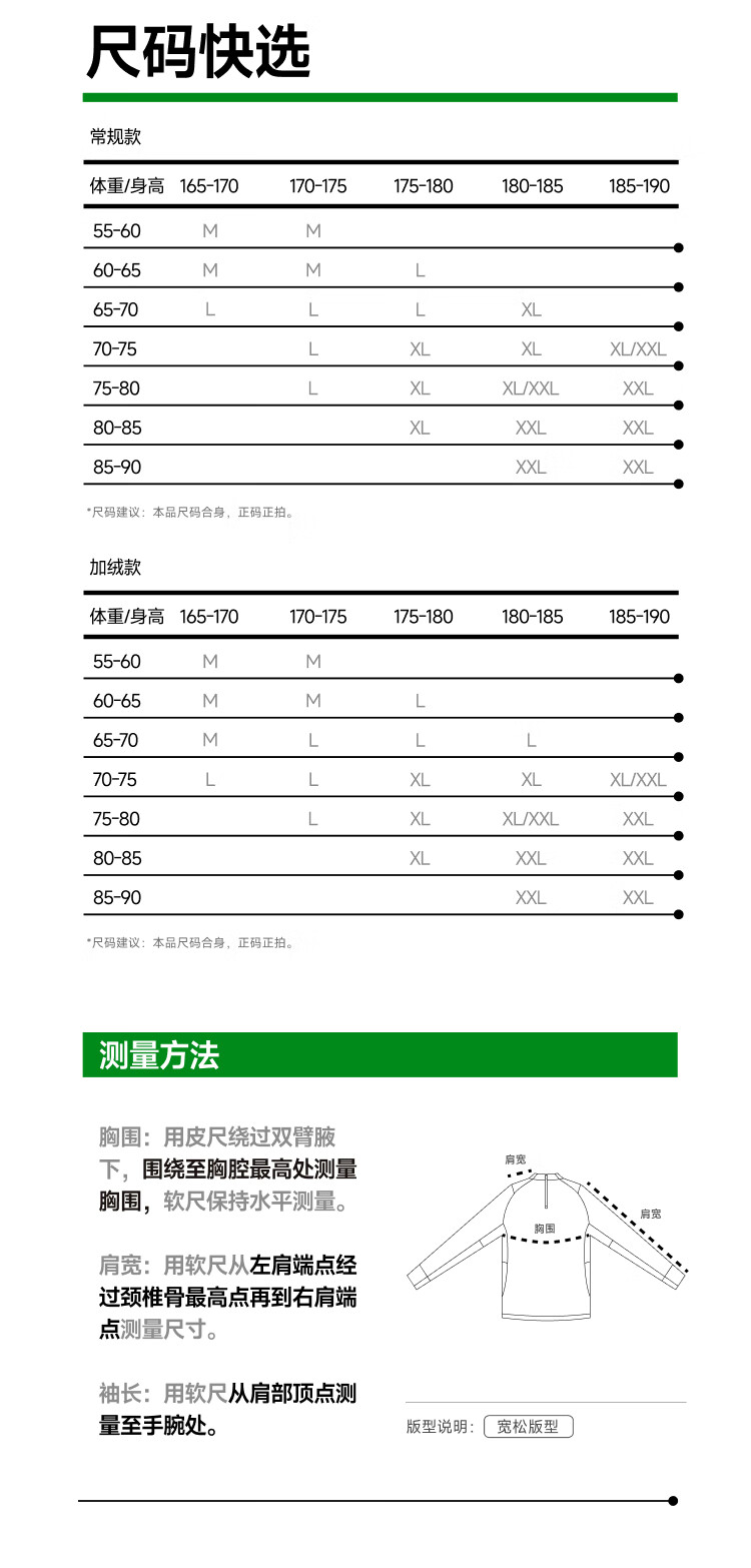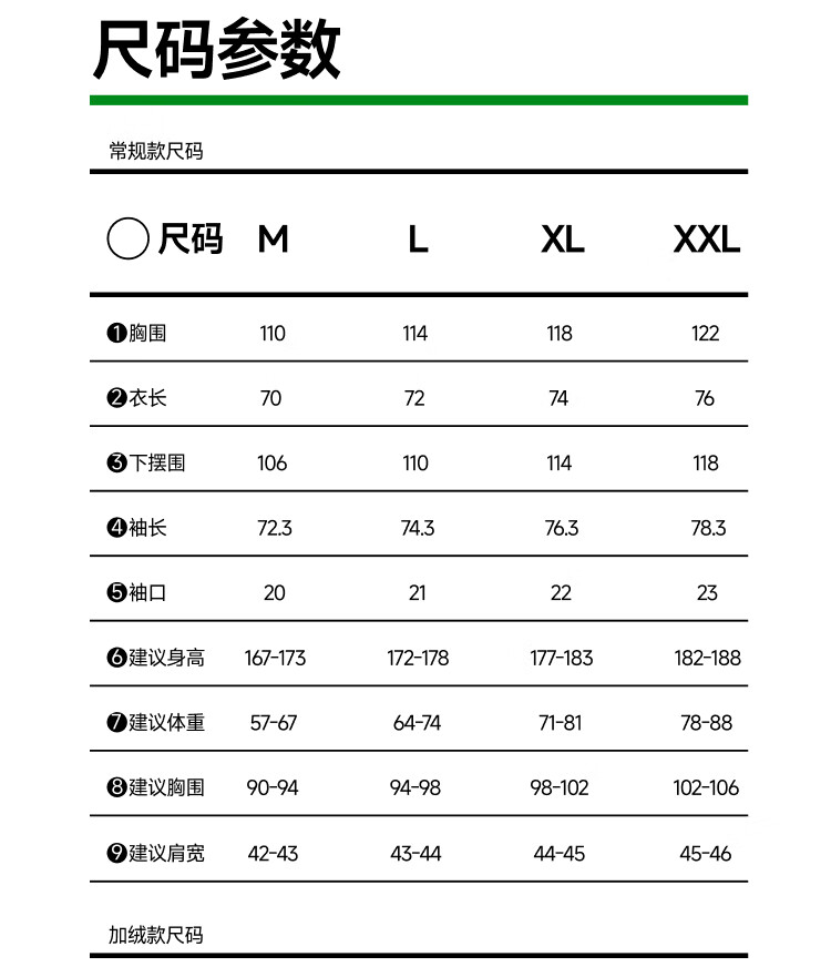 China (cm) 165 / 88-90 170 / 96-98 175 / 108-110 180 / 118-122 185 / 126-130
