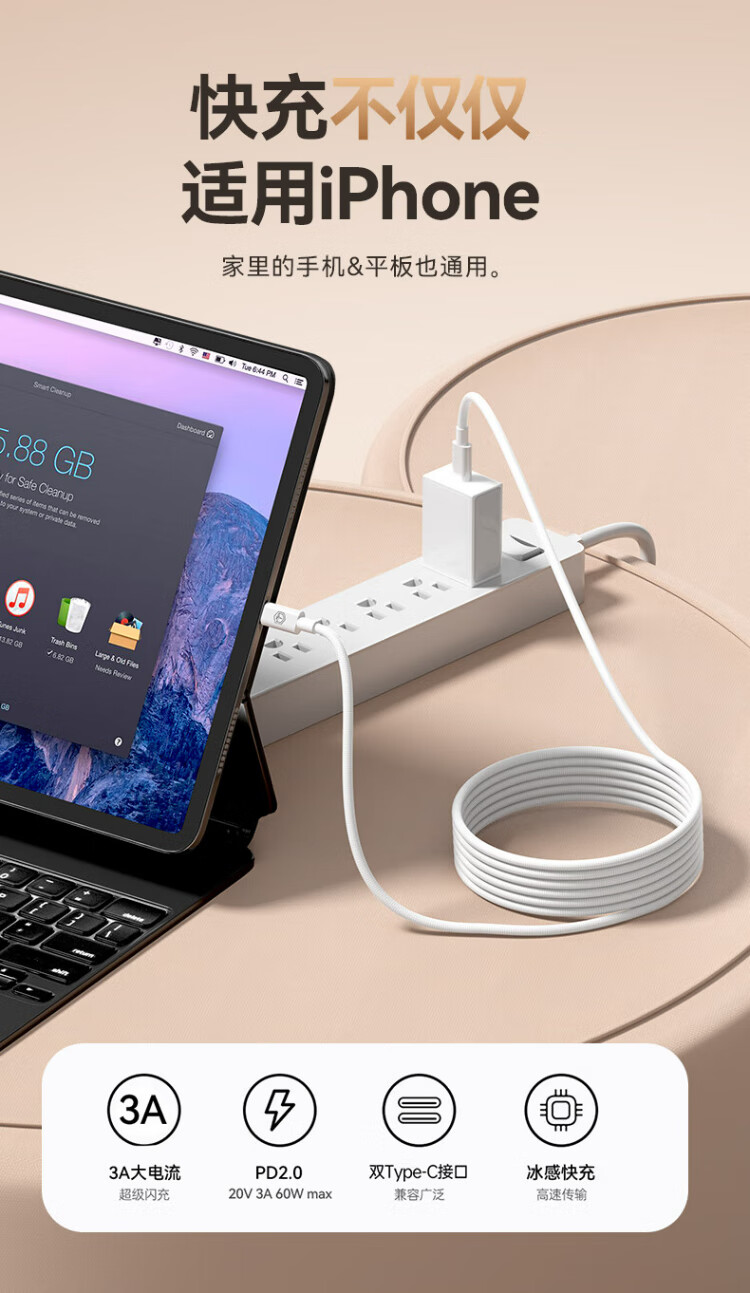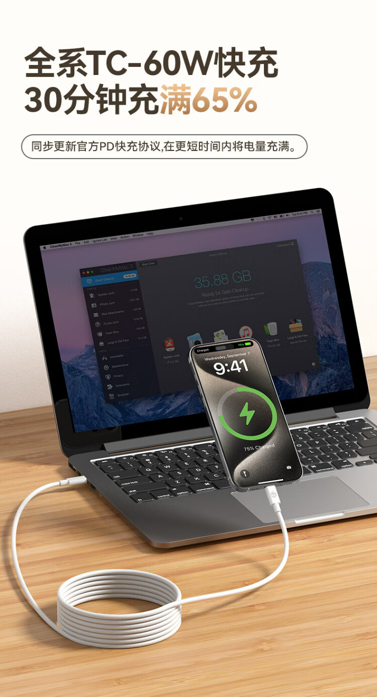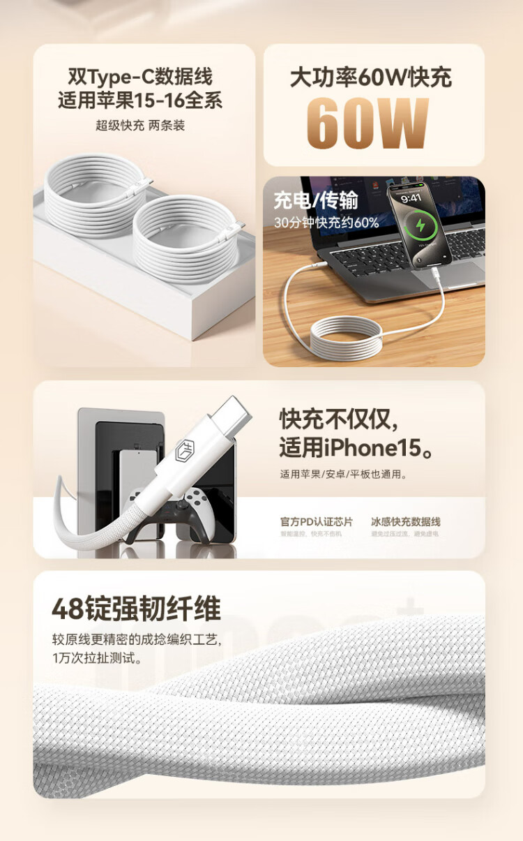 Made in Tokyo, two-pack PD60W fast charging cable Apple 17/16 charging cable Type-C data cable double-ended car suitable for iPhone Android mobile phone tablet notebook 1.5 meters