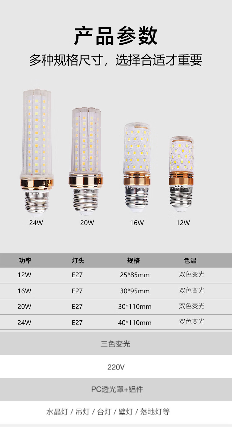 Jinggong LED corn light bulb energy-saving light bulb E27 large screw socket high-power three-color dimming chandelier household high-brightness light source