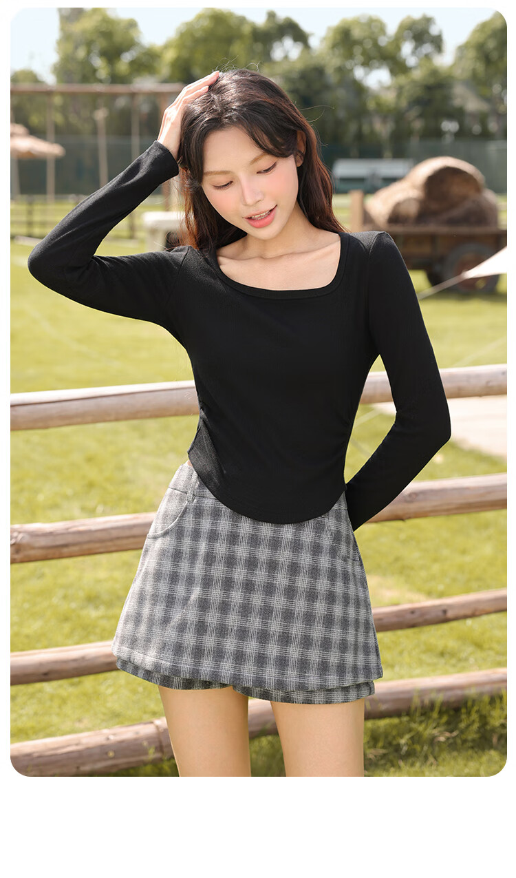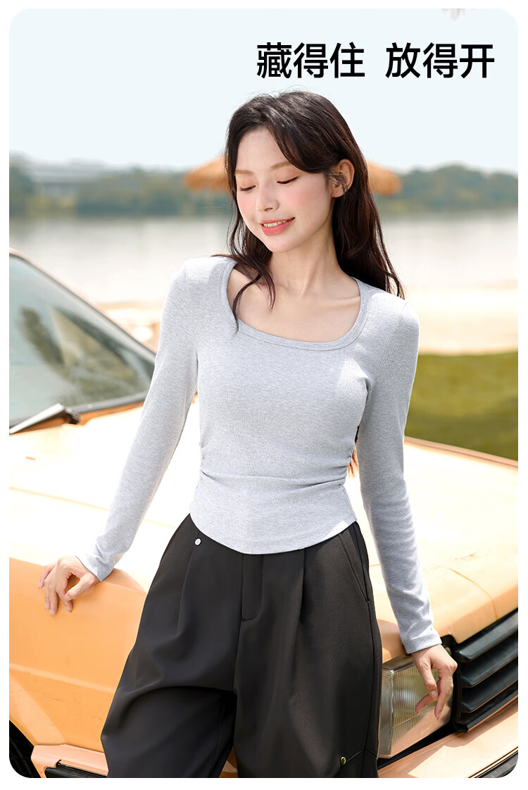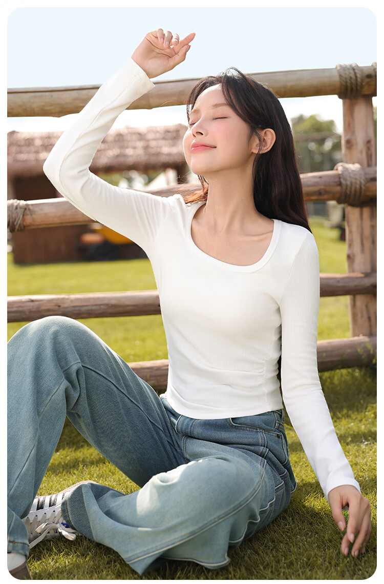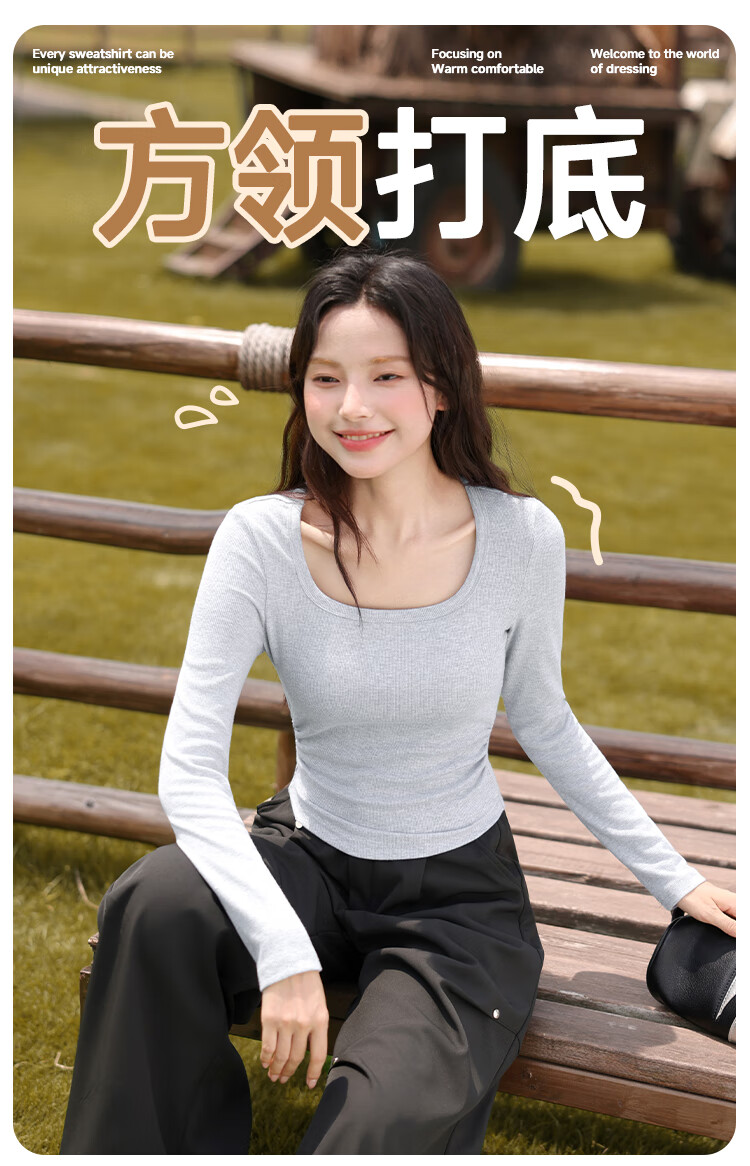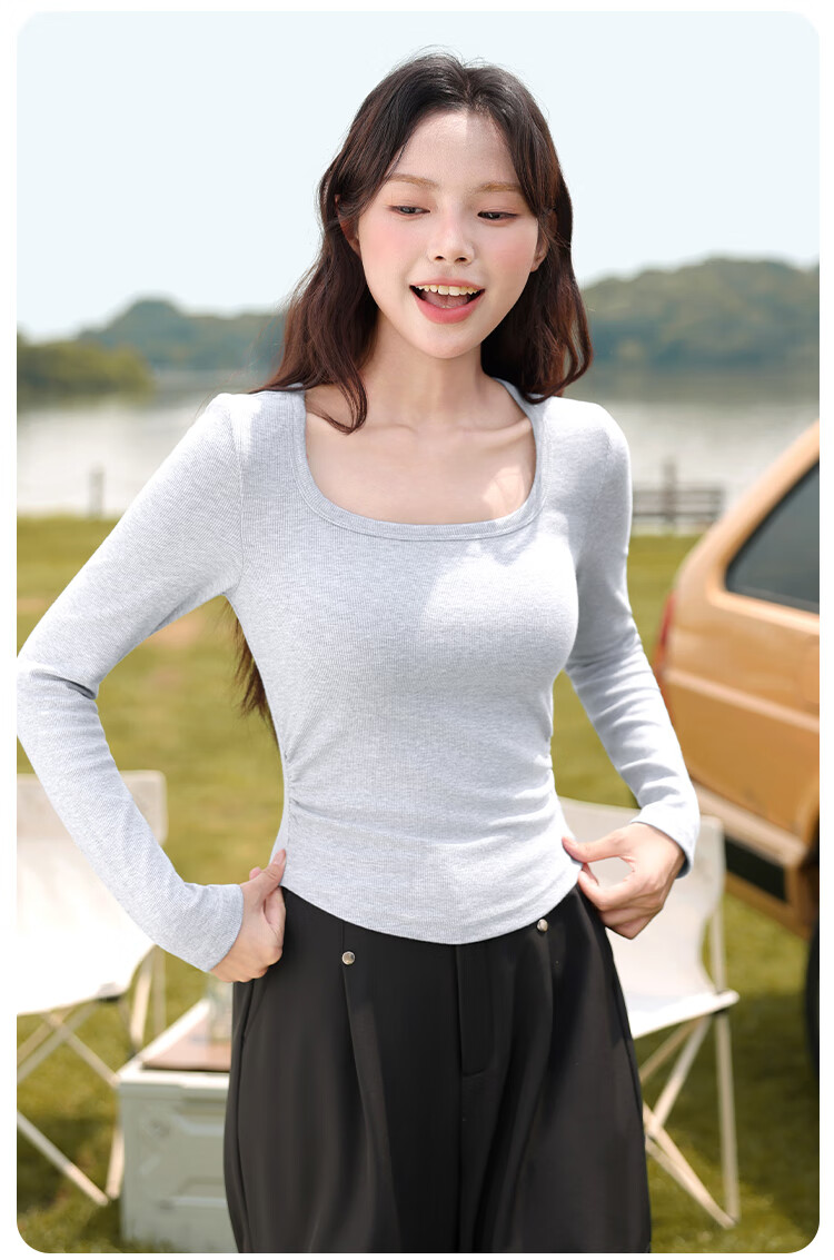 Baleno simple square collar pleated slim long-sleeved T-shirt for women 2025 autumn new comfortable casual design bottoming shirt