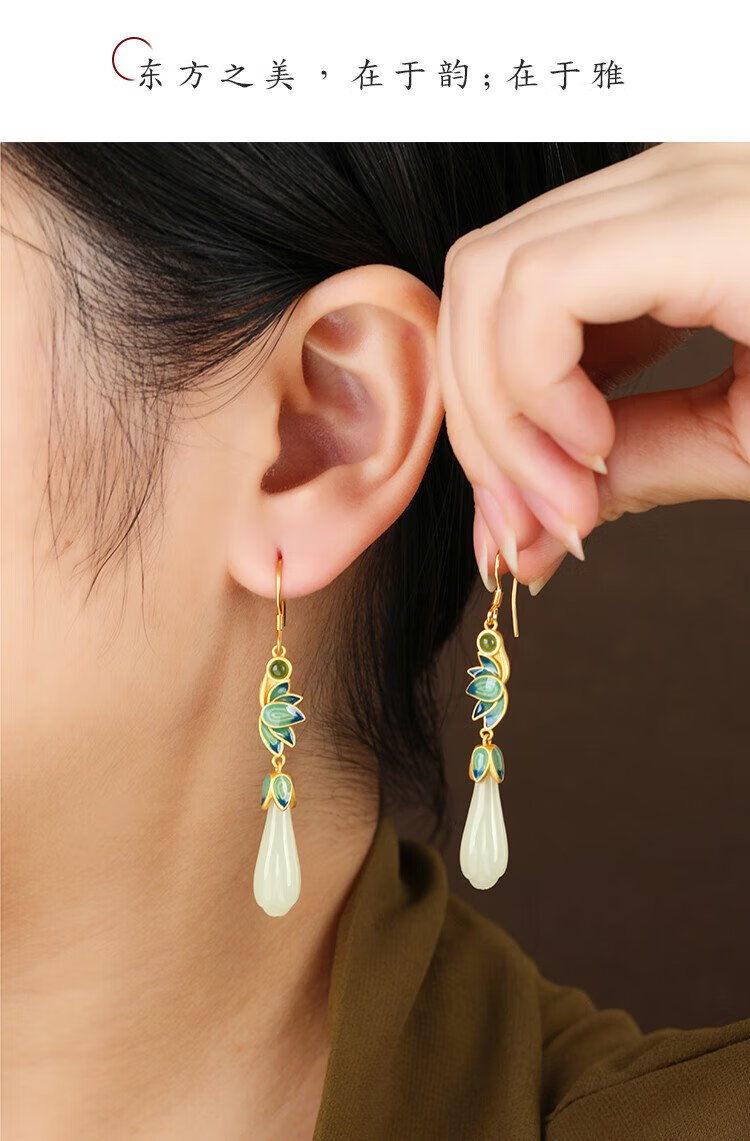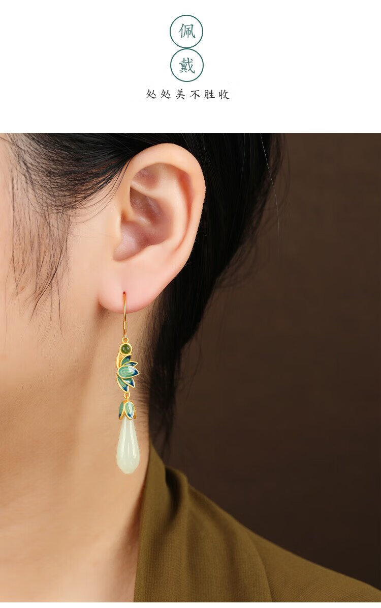 Little Silversmith Hetian Jade S925 Silver Magnolia Earrings Women's Enamel Lotus New Chinese Style Earrings Earrings Birthday Gifts