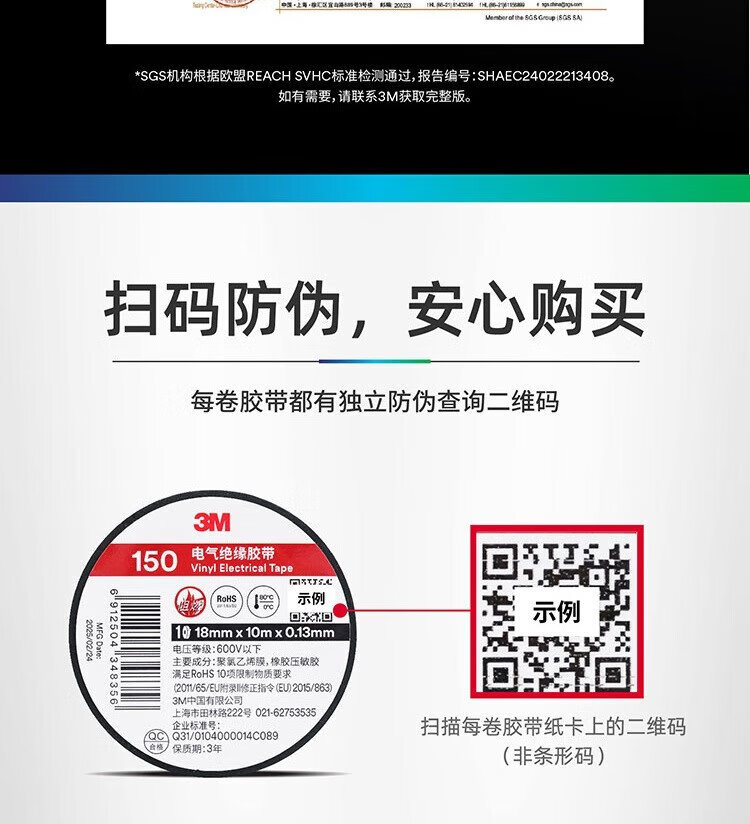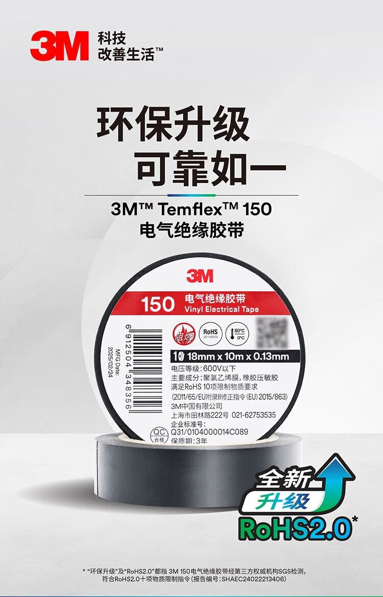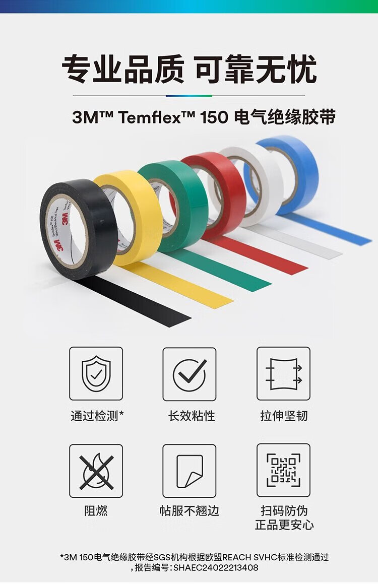 3M 150# 电工胶带 电气绝缘胶带 PVC电工胶布 无铅600V 防潮耐酸碱 黑18mm*10m*0.13mm 1桶(10卷)