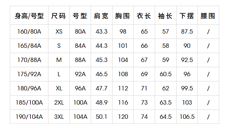 China (cm) 160-165/84-86 165-170 / 88-90 167-172 / 92-96 168-173 / 98-102 170-176 / 106-110