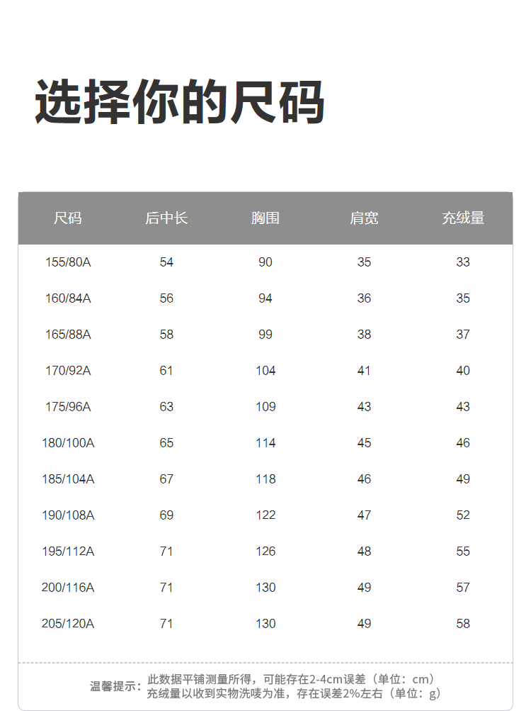 China (cm) 165 / 88-90 170 / 96-98 175 / 108-110 180 / 118-122 185 / 126-130