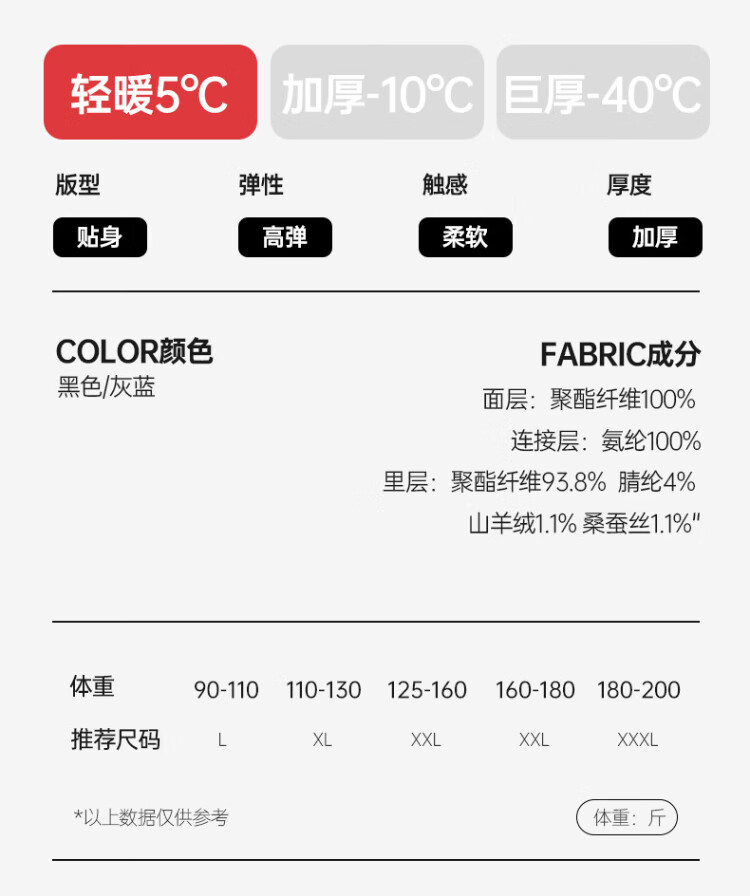 China (cm) 165 / 88-90 170 / 96-98 175 / 108-110 180 / 118-122 185 / 126-130