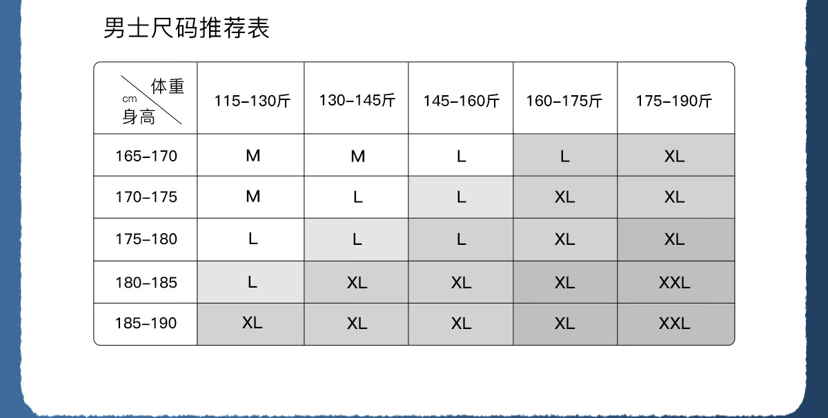 China (cm) 165 / 88-90 170 / 96-98 175 / 108-110 180 / 118-122 185 / 126-130