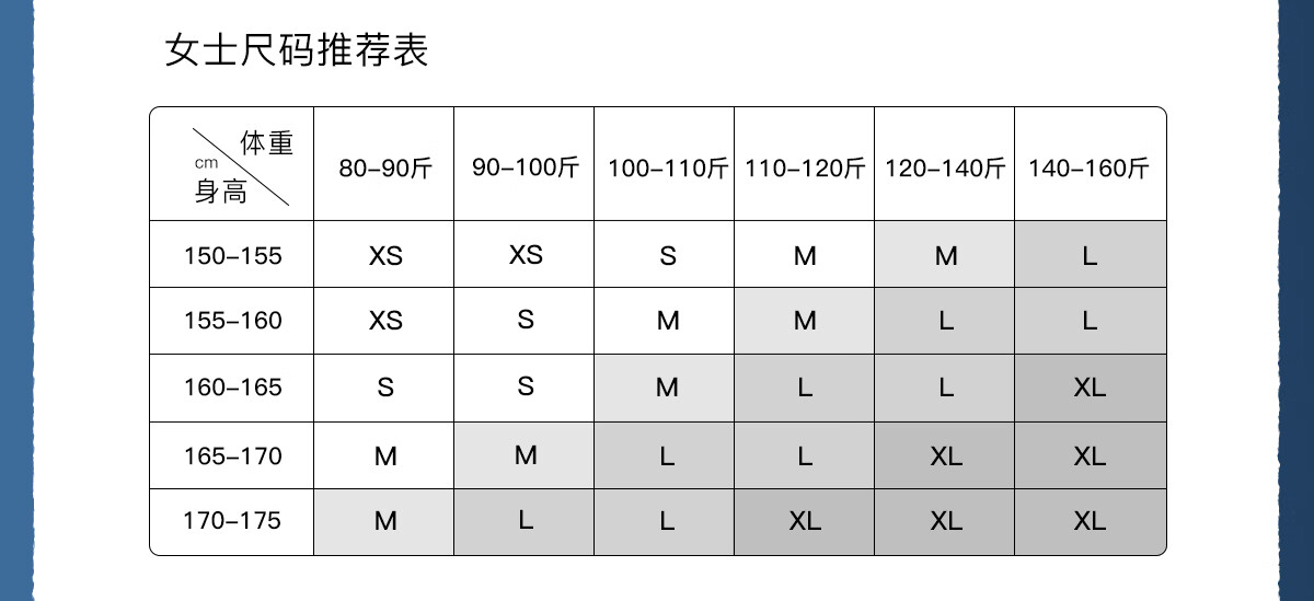 China (cm) 160-165/84-86 165-170 / 88-90 167-172 / 92-96 168-173 / 98-102 170-176 / 106-110