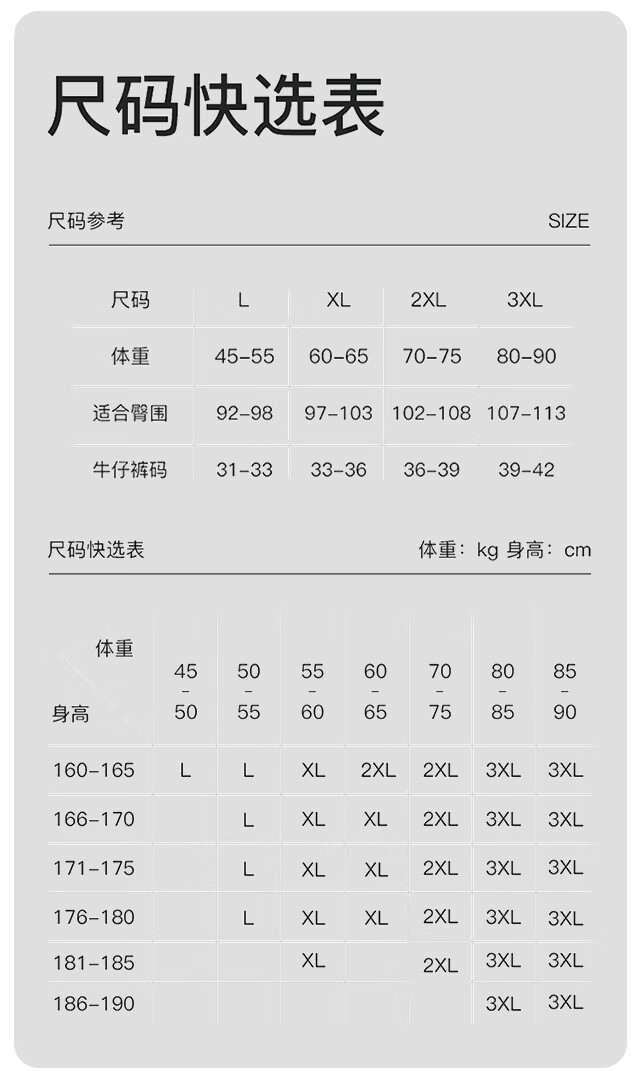 China (cm) 165 / 88-90 170 / 96-98 175 / 108-110 180 / 118-122 185 / 126-130