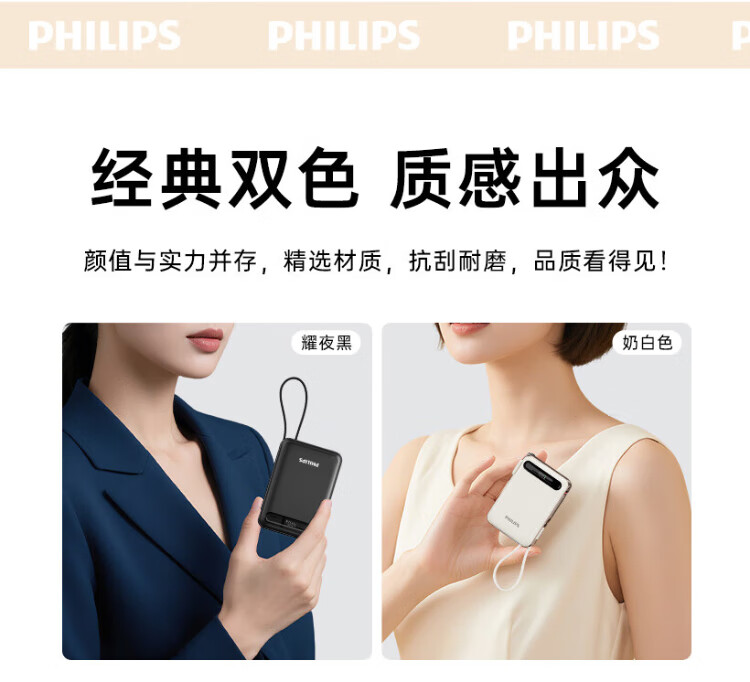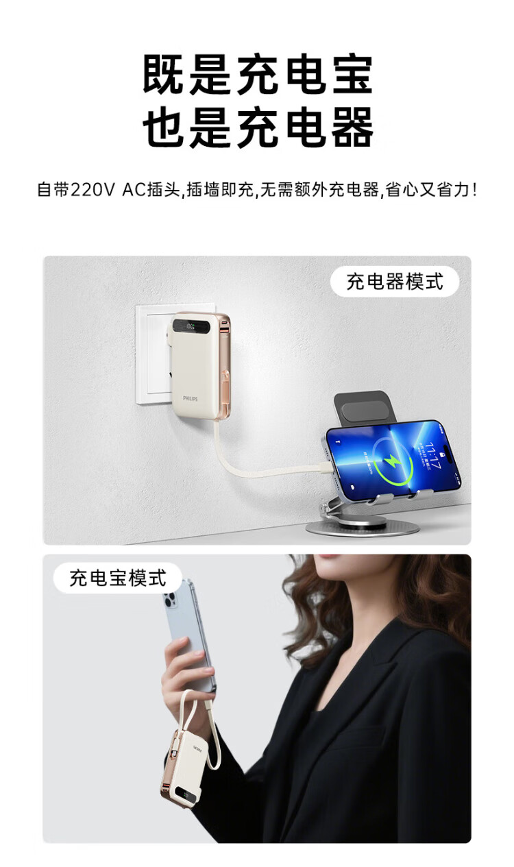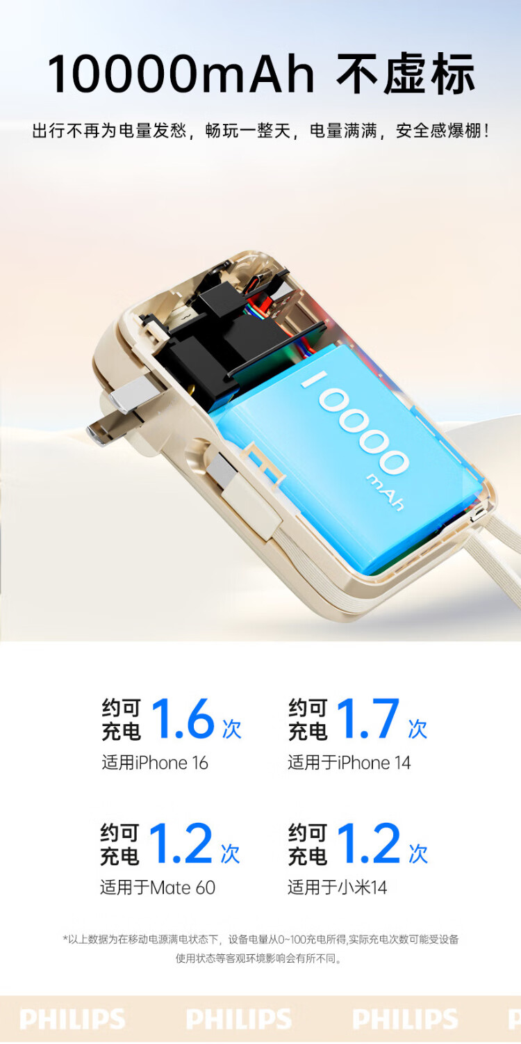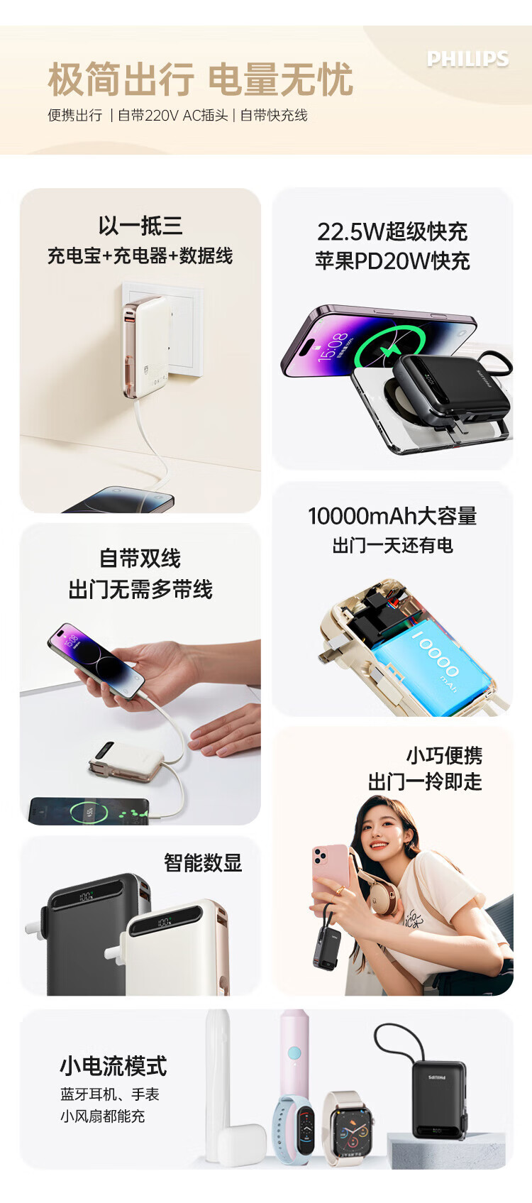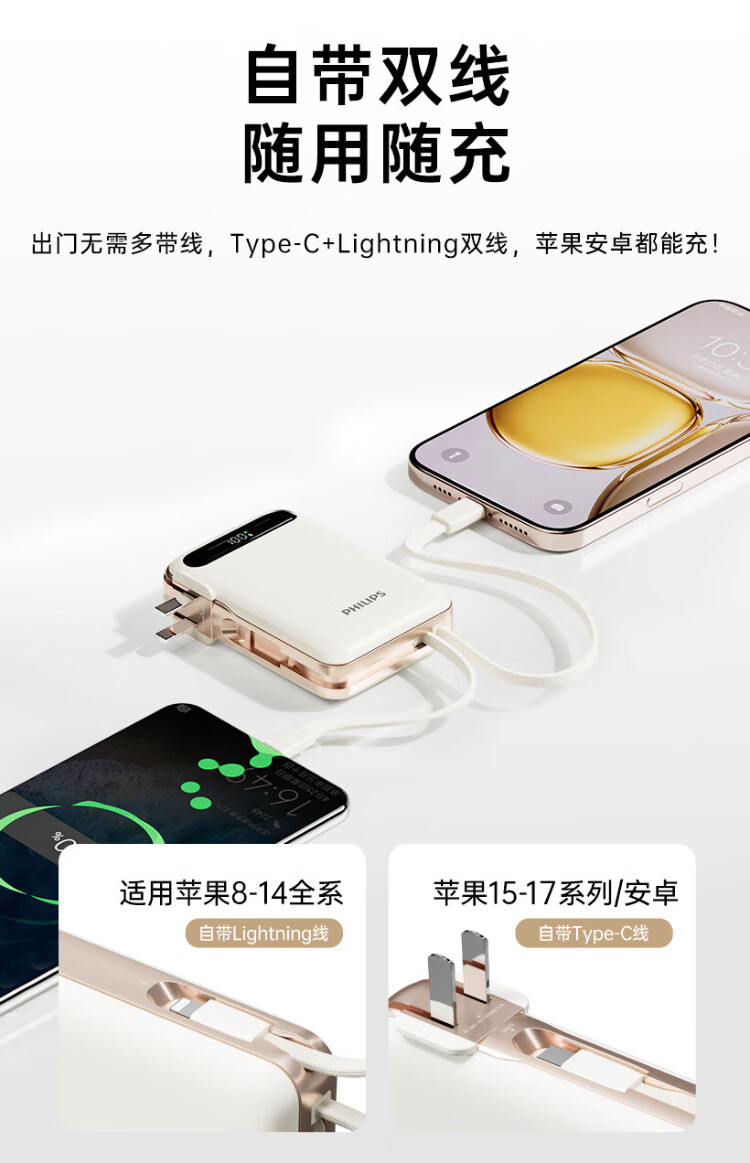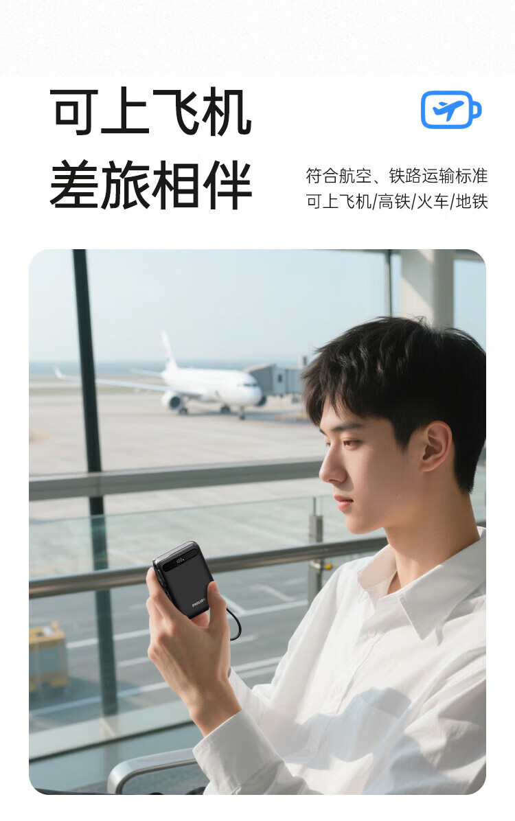 Philips three-in-one power bank, national standard 3C certified, can be used on airplanes, comes with a two-wire plug, 10,000 mAh, compact, 22.5W fast charging, large capacity, suitable for Apple 17 and Xiaomi