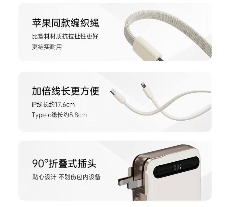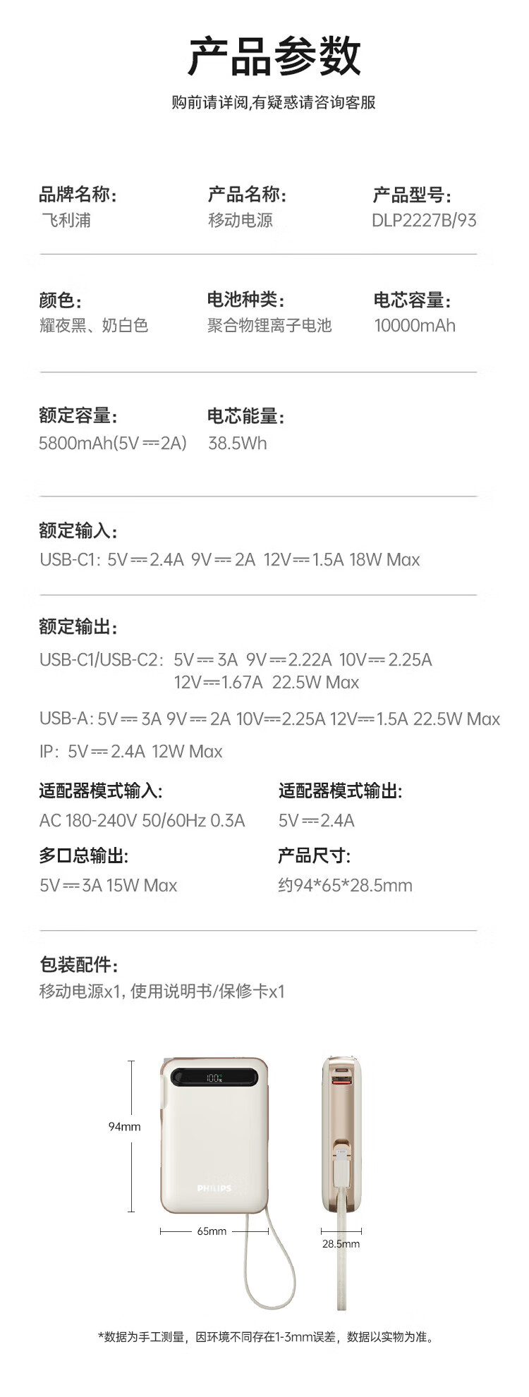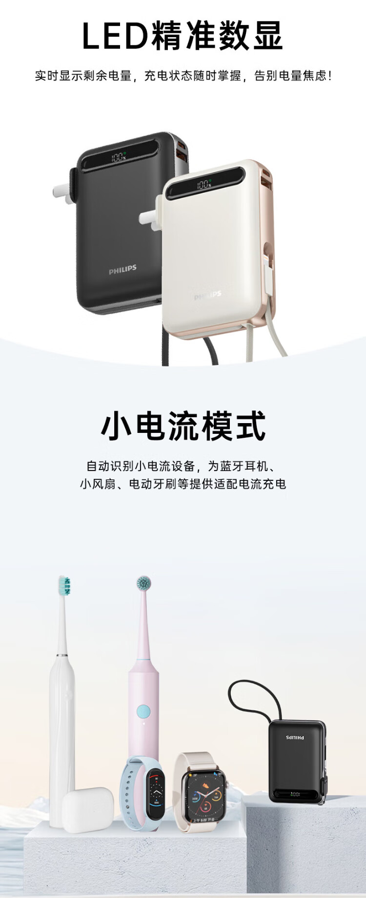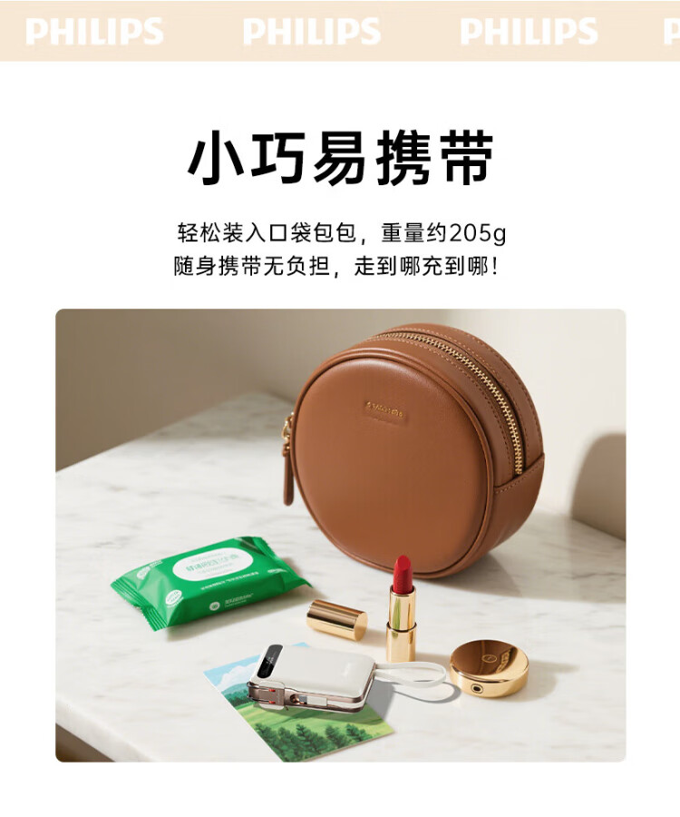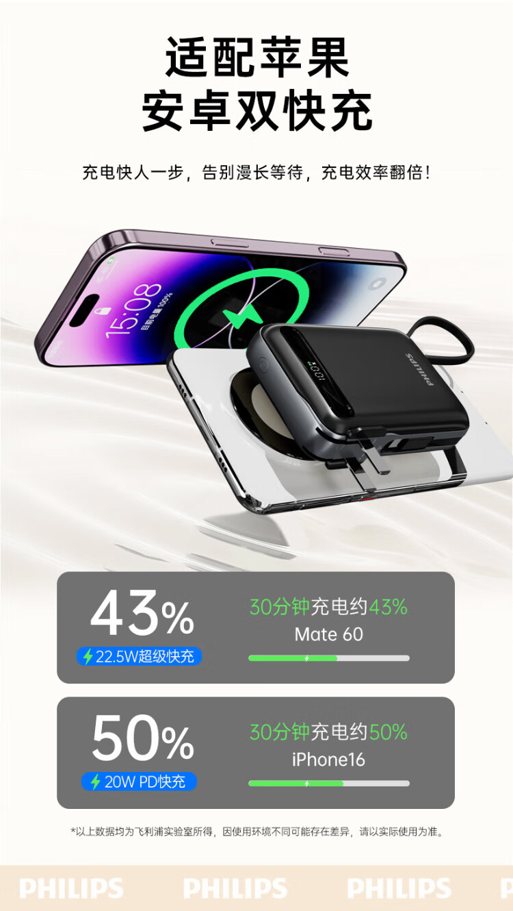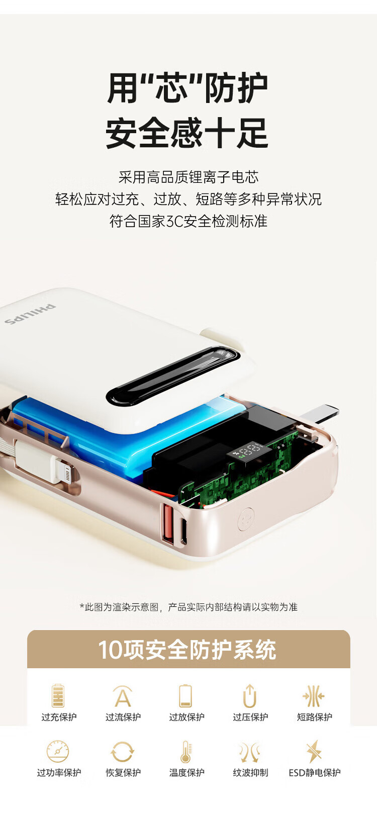 Philips three-in-one power bank, national standard 3C certified, can be used on airplanes, comes with a two-wire plug, 10,000 mAh, compact, 22.5W fast charging, large capacity, suitable for Apple 17 and Xiaomi