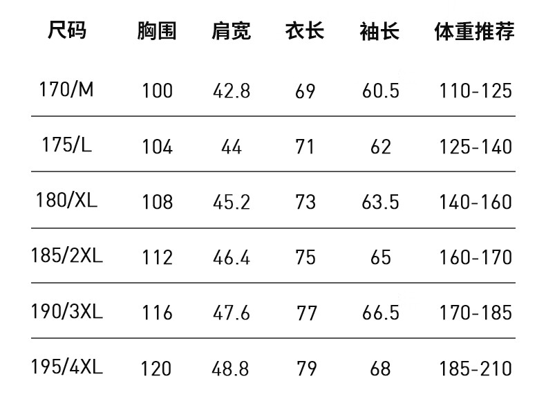China (cm) 165 / 88-90 170 / 96-98 175 / 108-110 180 / 118-122 185 / 126-130