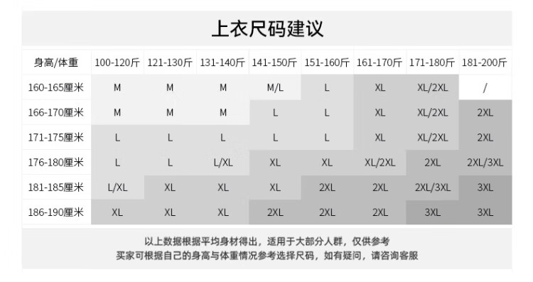 China (cm) 165 / 88-90 170 / 96-98 175 / 108-110 180 / 118-122 185 / 126-130