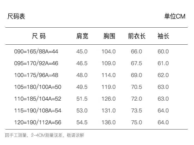 China (cm) 160-165/84-86 165-170 / 88-90 167-172 / 92-96 168-173 / 98-102 170-176 / 106-110