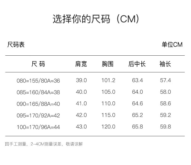 China (cm) 160-165/84-86 165-170 / 88-90 167-172 / 92-96 168-173 / 98-102 170-176 / 106-110
