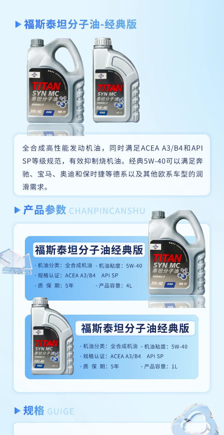 FUCHS Titan Molecular Oil Classic Edition 5W-40 4L SP A3/B4 Mercedes-Benz, BMW, Audi, Porsche and other German and European models