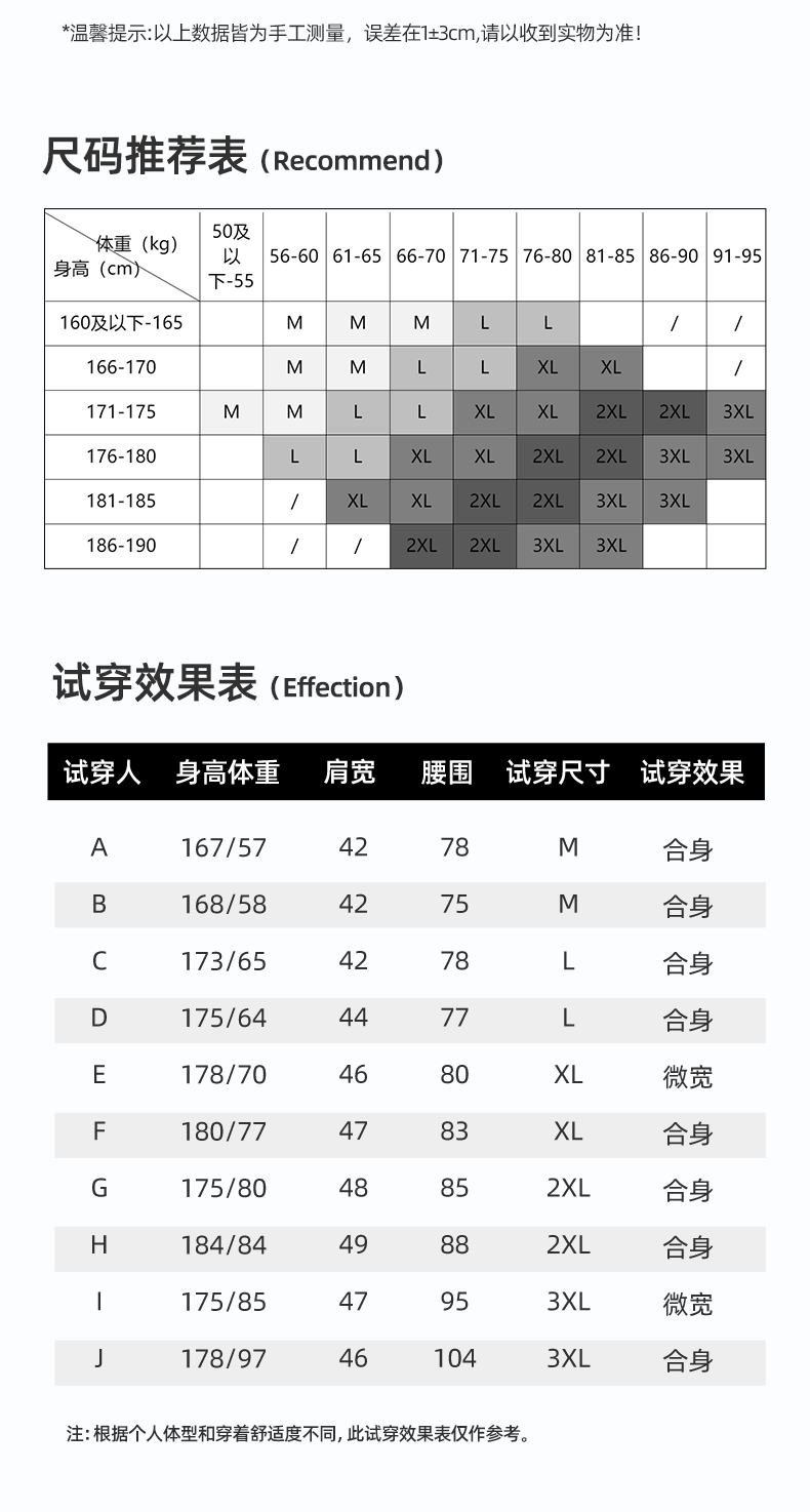 China (cm) 165 / 88-90 170 / 96-98 175 / 108-110 180 / 118-122 185 / 126-130