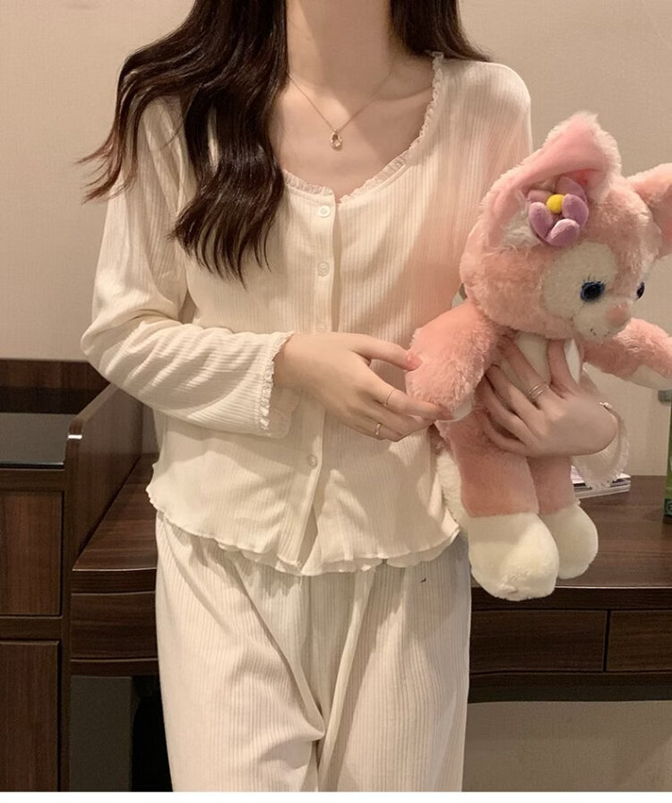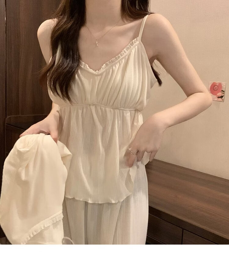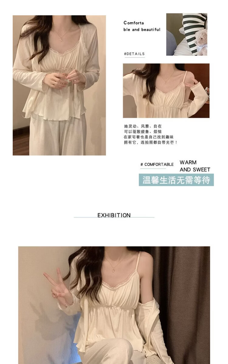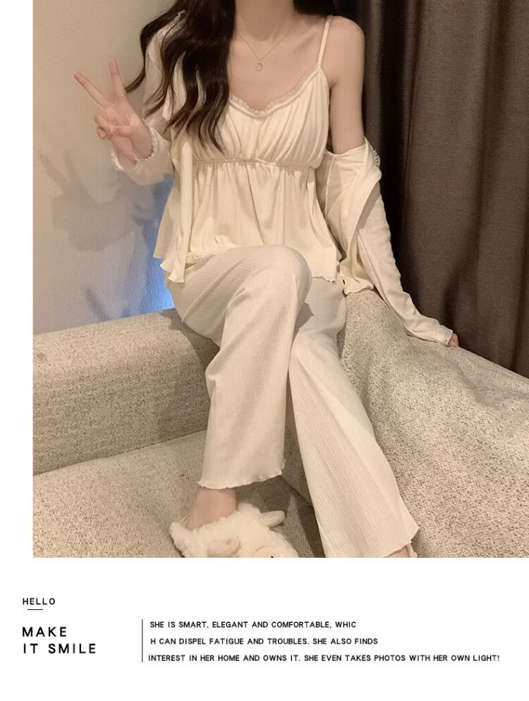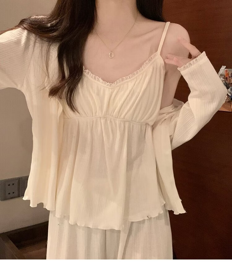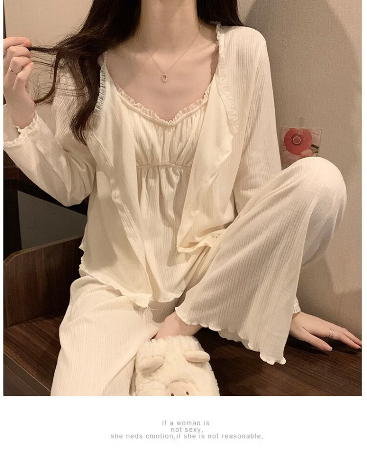 Ancient and modern (GUJIN) sexy pure desire three-piece pajamas for women with breast pads, spring and autumn home clothes, combed cotton outer wear pajamas