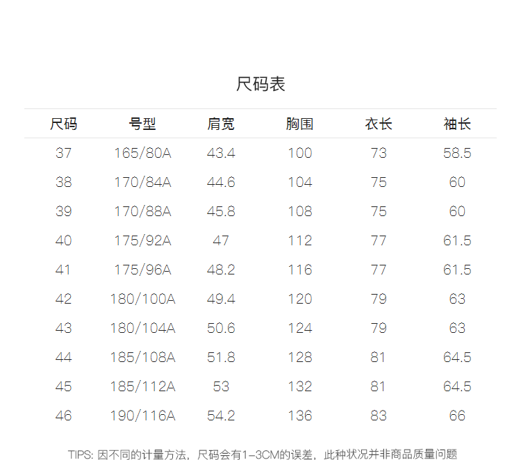 China (cm) 165 / 88-90 170 / 96-98 175 / 108-110 180 / 118-122 185 / 126-130