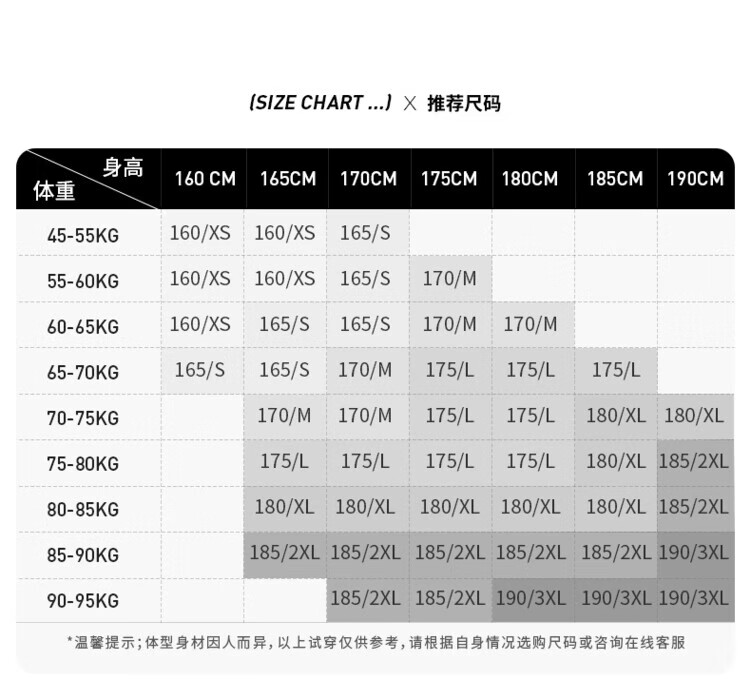 China (cm) 165 / 88-90 170 / 96-98 175 / 108-110 180 / 118-122 185 / 126-130