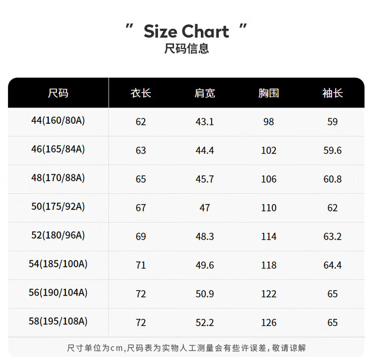 China (cm) 160-165/84-86 165-170 / 88-90 167-172 / 92-96 168-173 / 98-102 170-176 / 106-110
