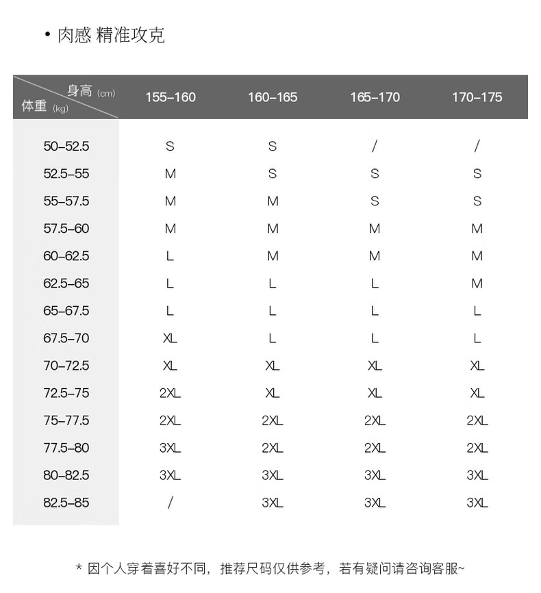 China (cm) 160-165/84-86 165-170 / 88-90 167-172 / 92-96 168-173 / 98-102 170-176 / 106-110