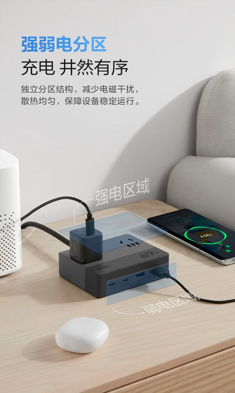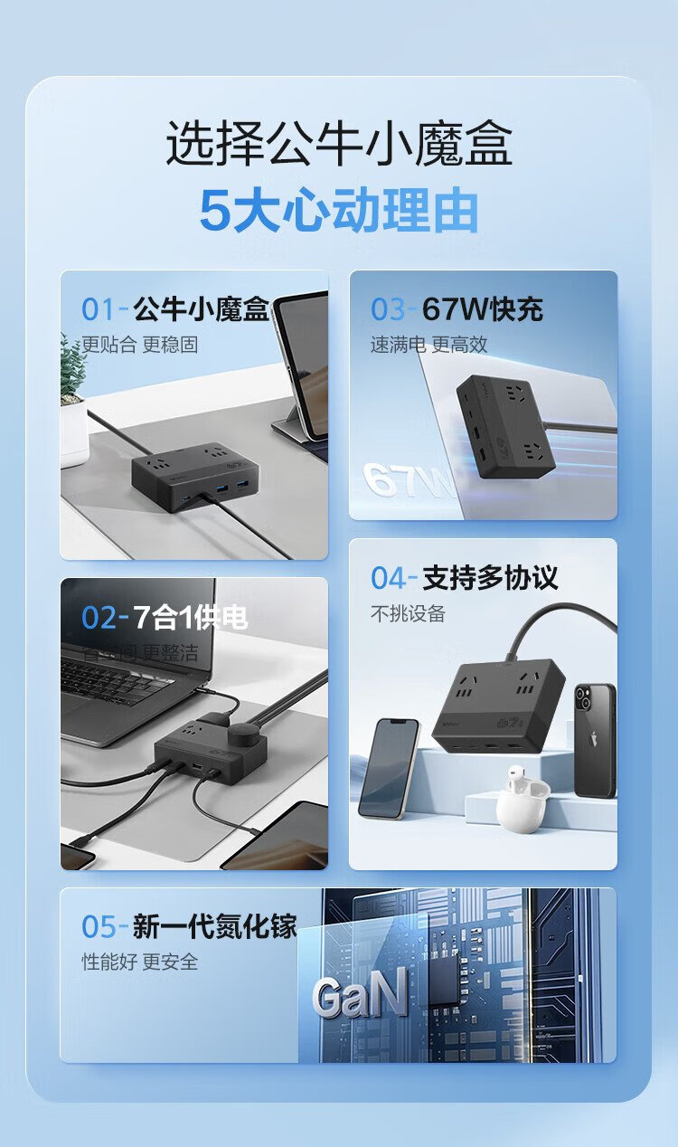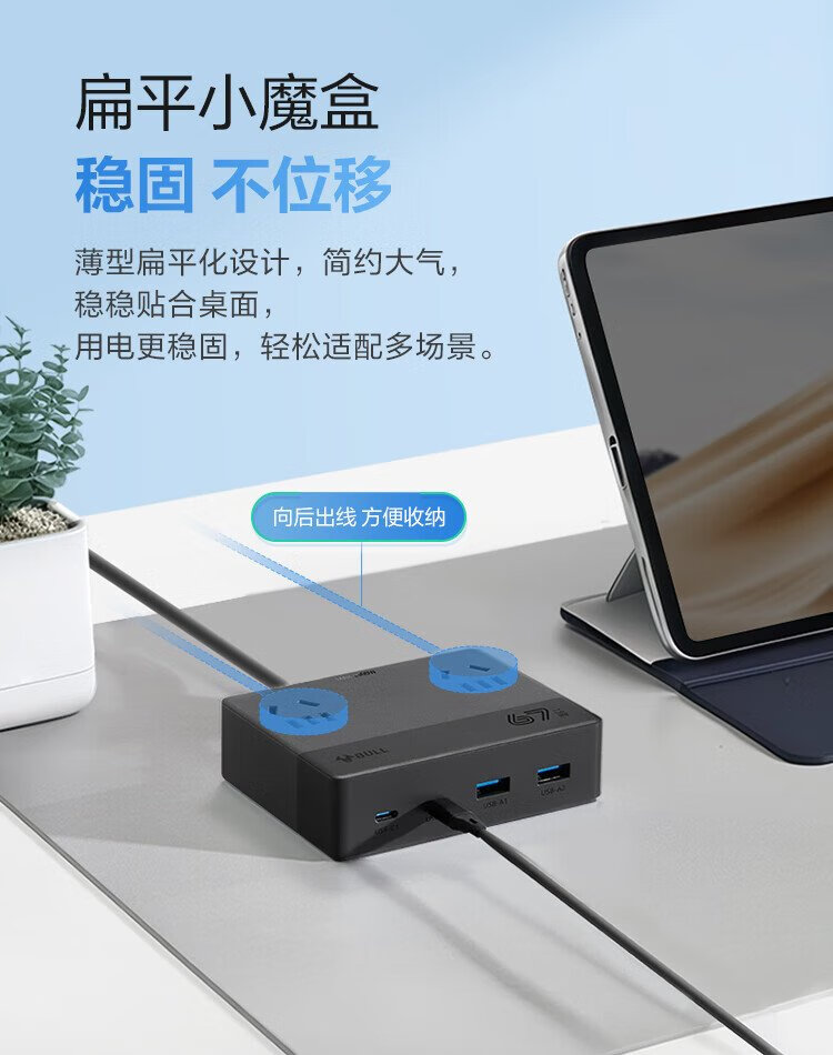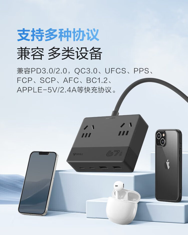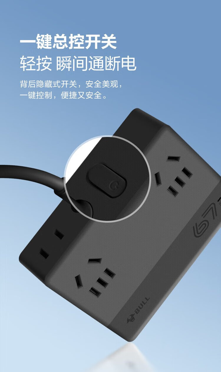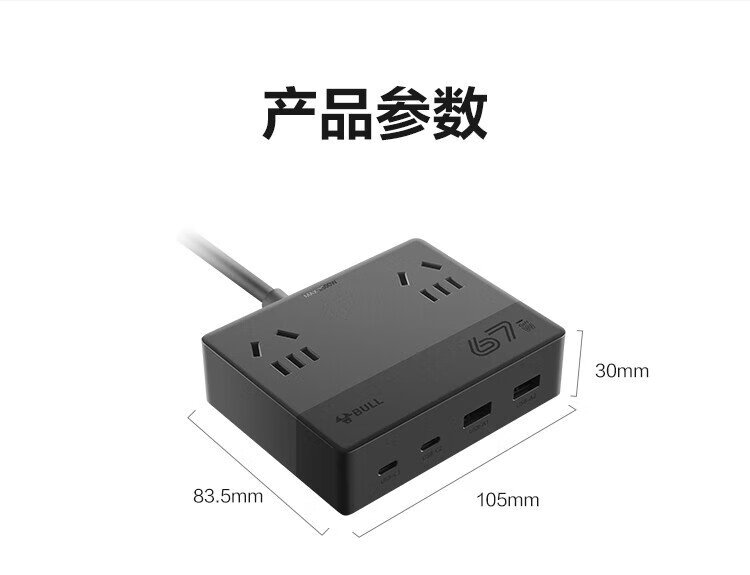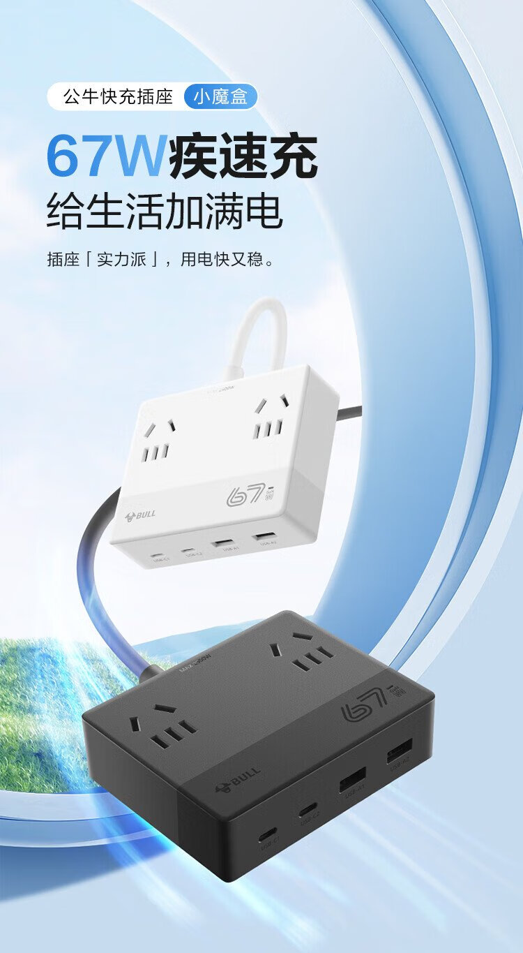 BULL 67W gallium nitride small magic box socket/plug board/socket strip/wiring board 3C certification suitable for iPhone17 master control switch 2A2C+3 positions full length 1.5 meters black
