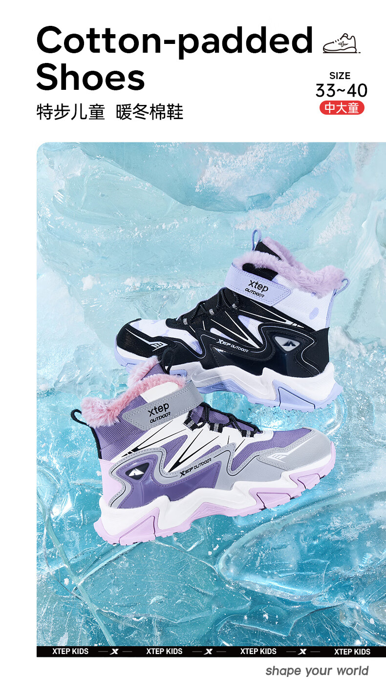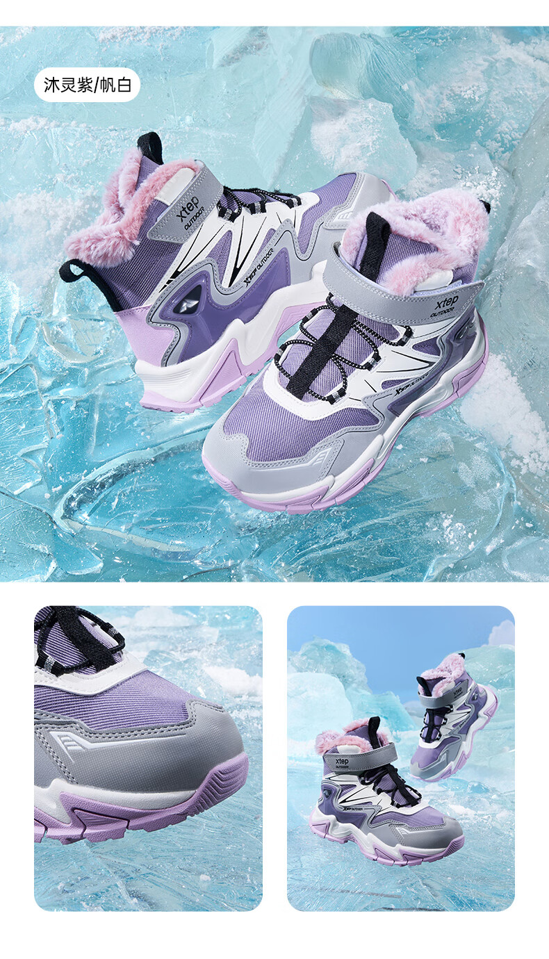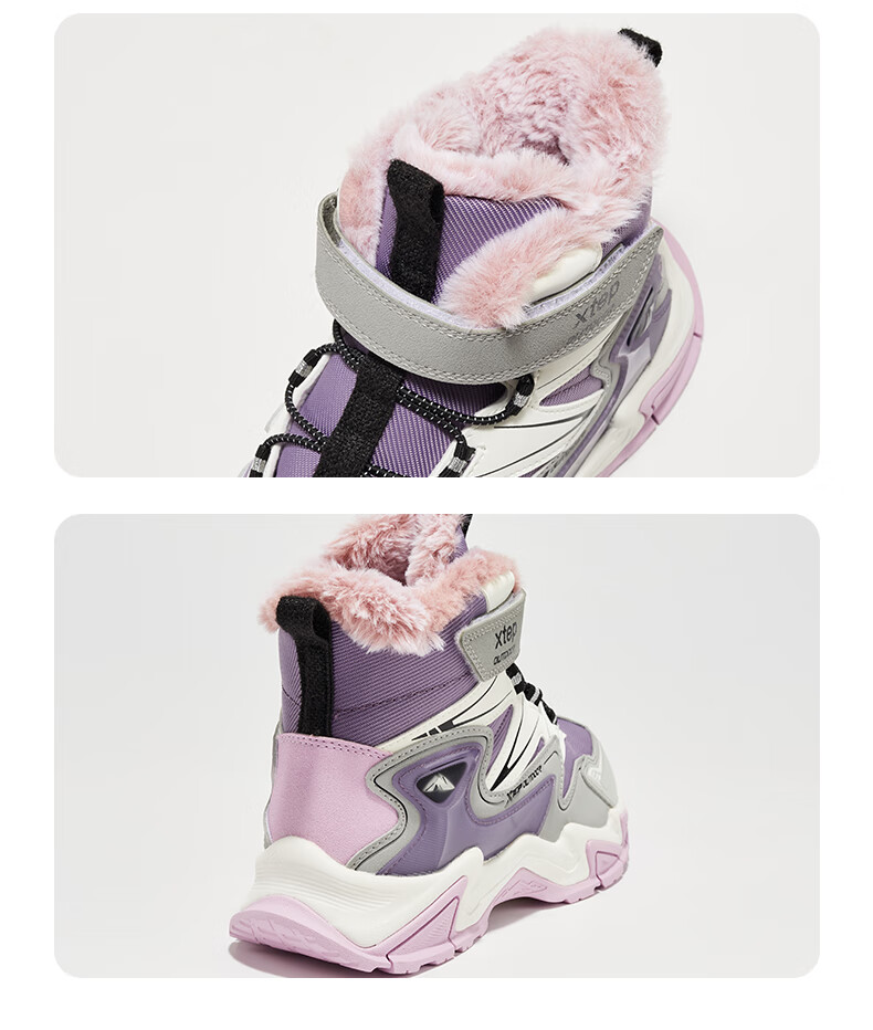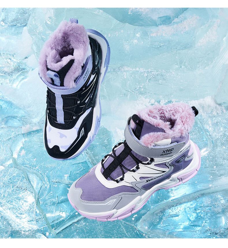 XTEP Children's Icebreaker 1.0 Cotton Boots Winter Girls' Rex Rabbit Velvet High Top Thickened Warm Cotton Shoes Black/Taro Purple 33
