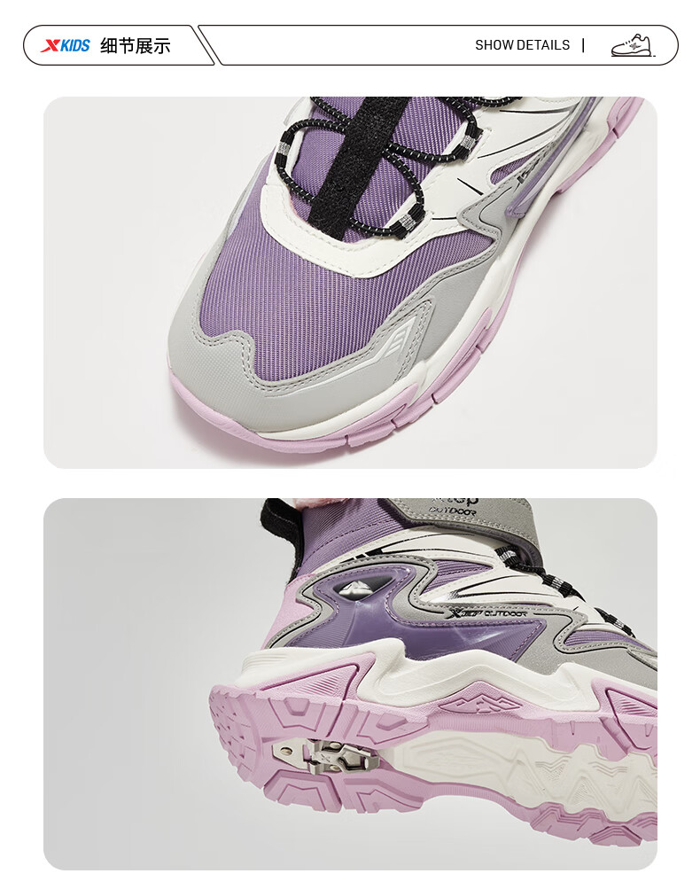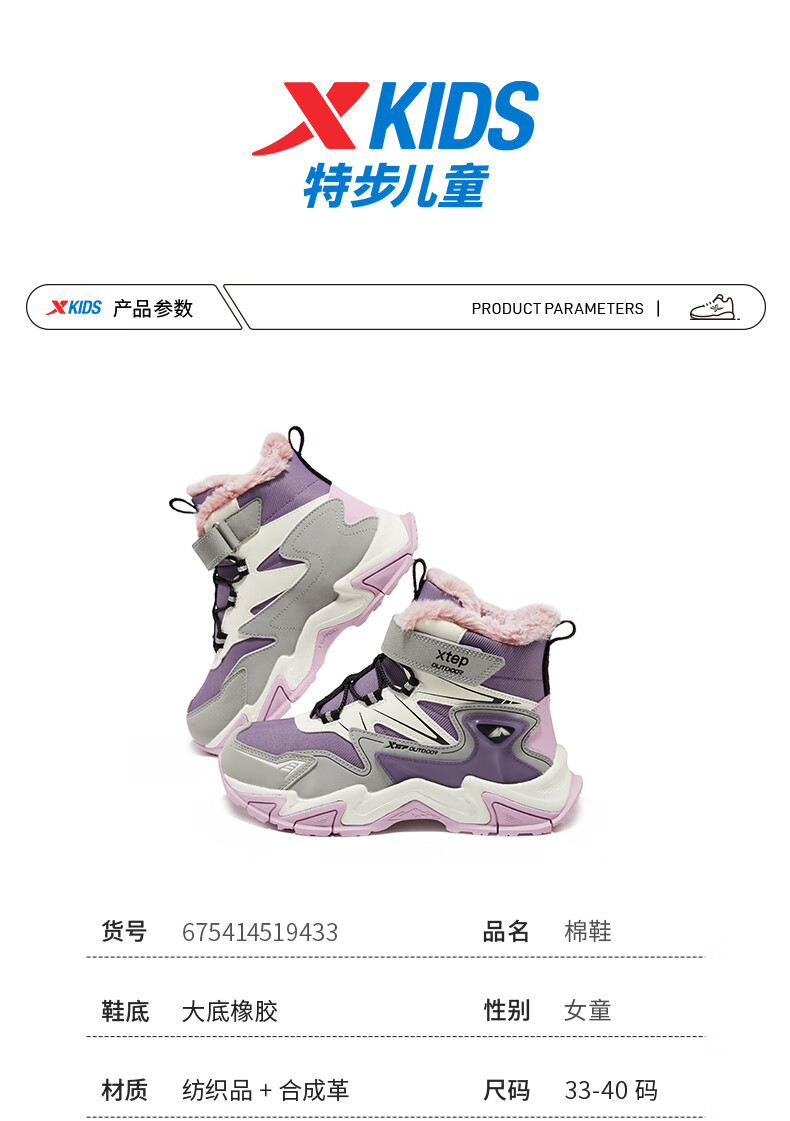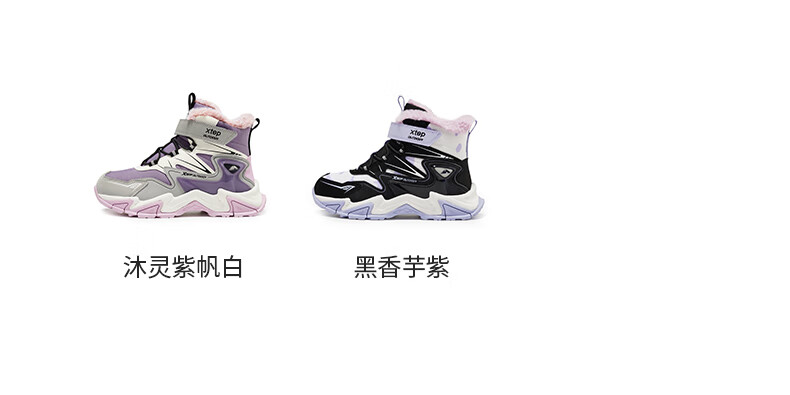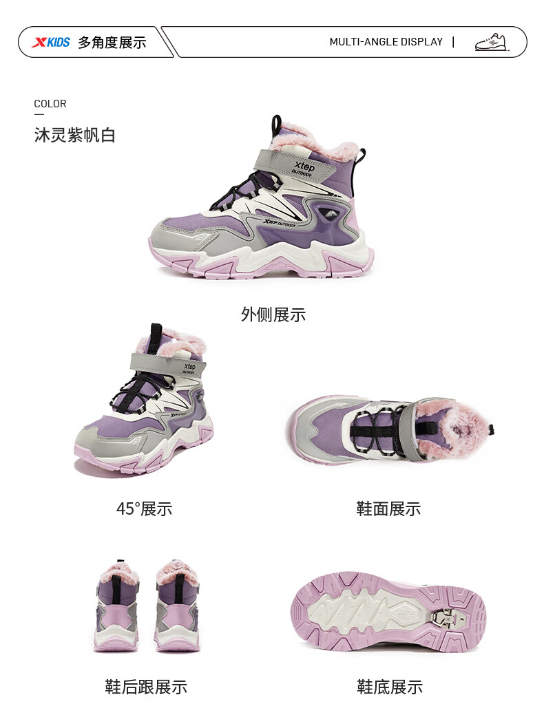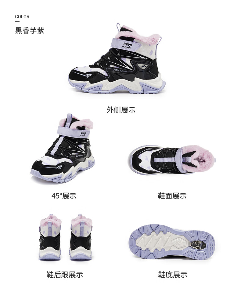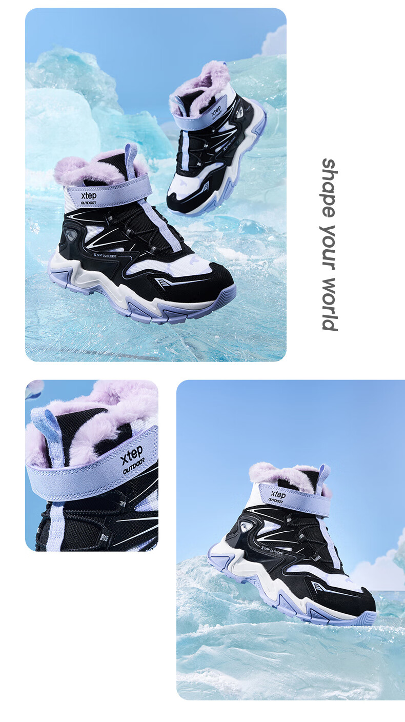 XTEP Children's Icebreaker 1.0 Cotton Boots Winter Girls' Rex Rabbit Velvet High Top Thickened Warm Cotton Shoes Black/Taro Purple 33