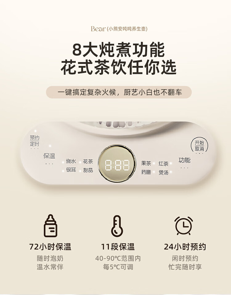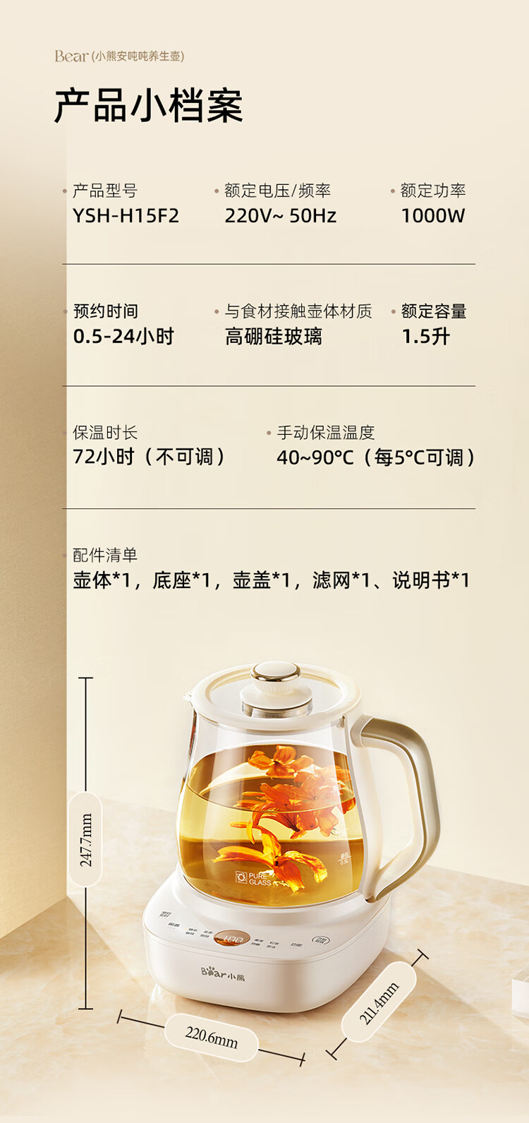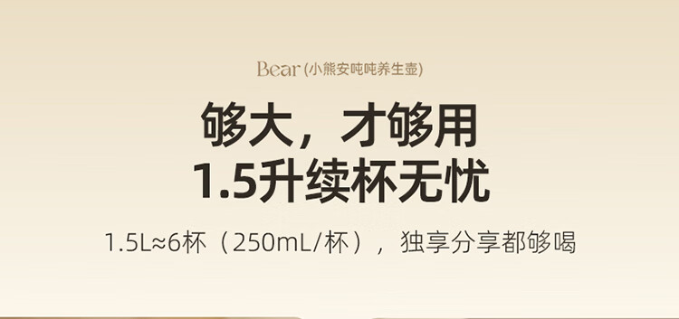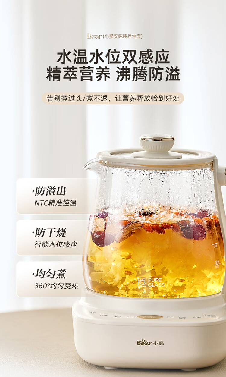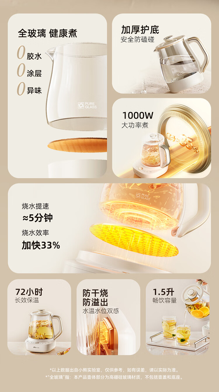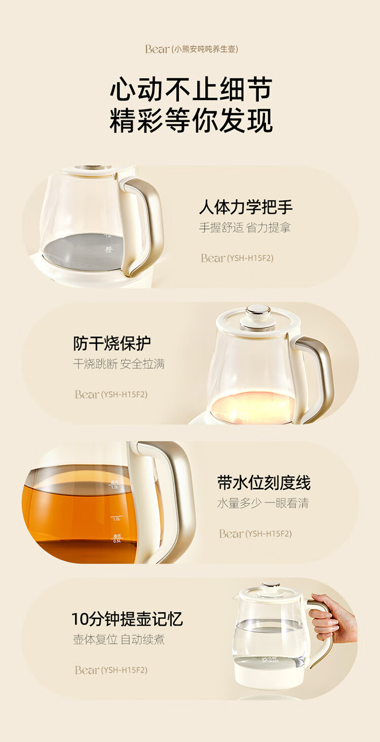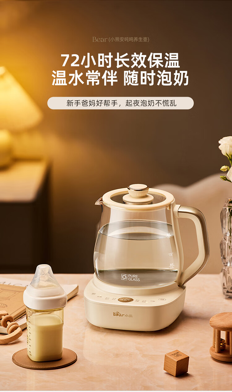 Bear all-glass health pot, Anton constant temperature pot, office multi-function teapot, 0 glue, 0 metal, 24h reservation, 72h heat preservation, 1.5L YSH-H15F2