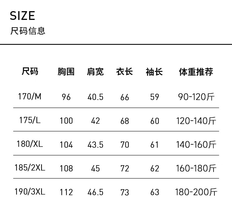 China (cm) 165 / 88-90 170 / 96-98 175 / 108-110 180 / 118-122 185 / 126-130
