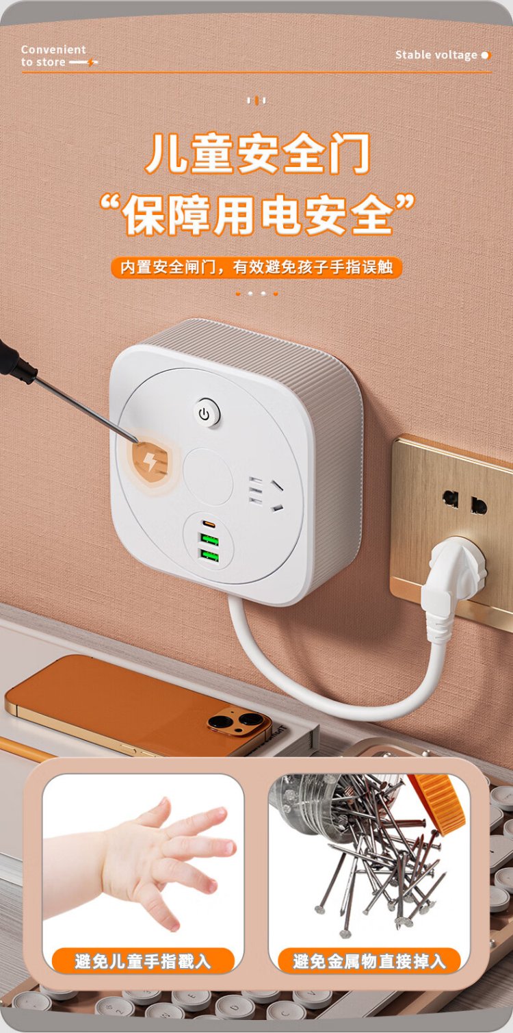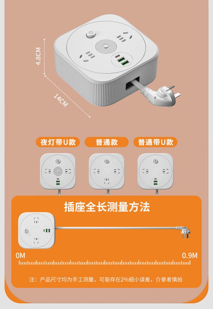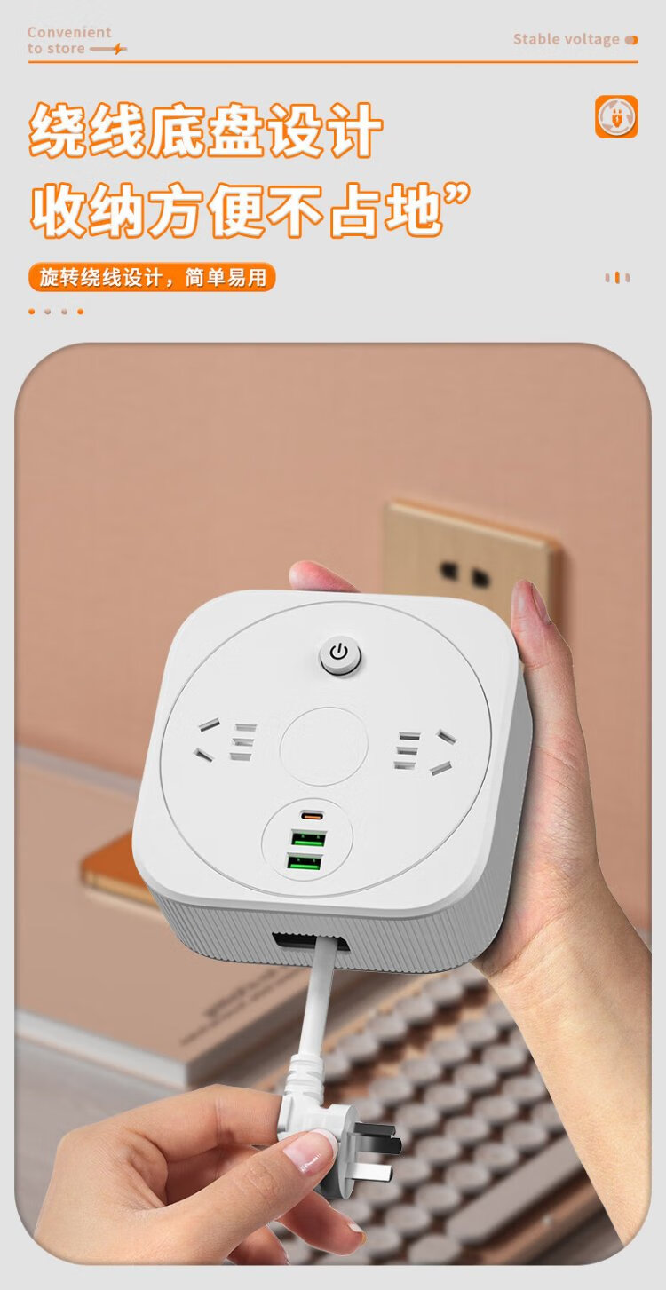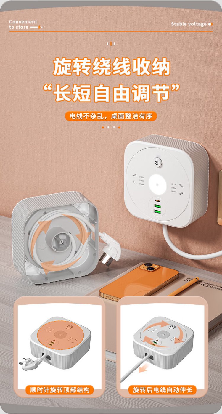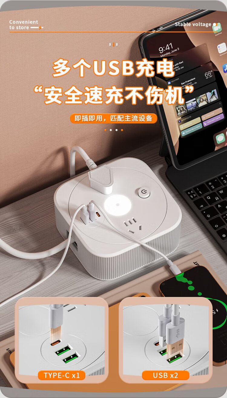 Sushi Helm wall-mounted socket strip/socket strip/terminal strip/pull cord board | Storage cable 2USB+Type-C night light 4-position master control 1.9 meters