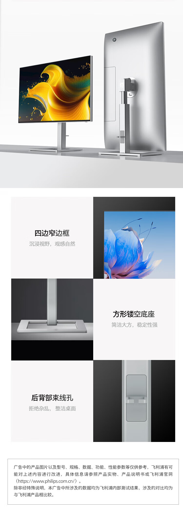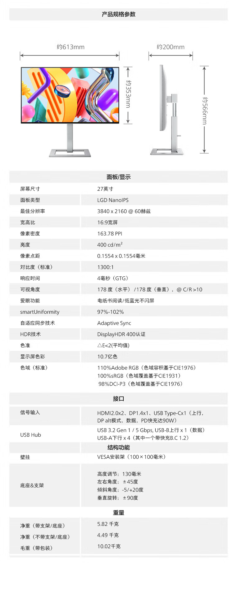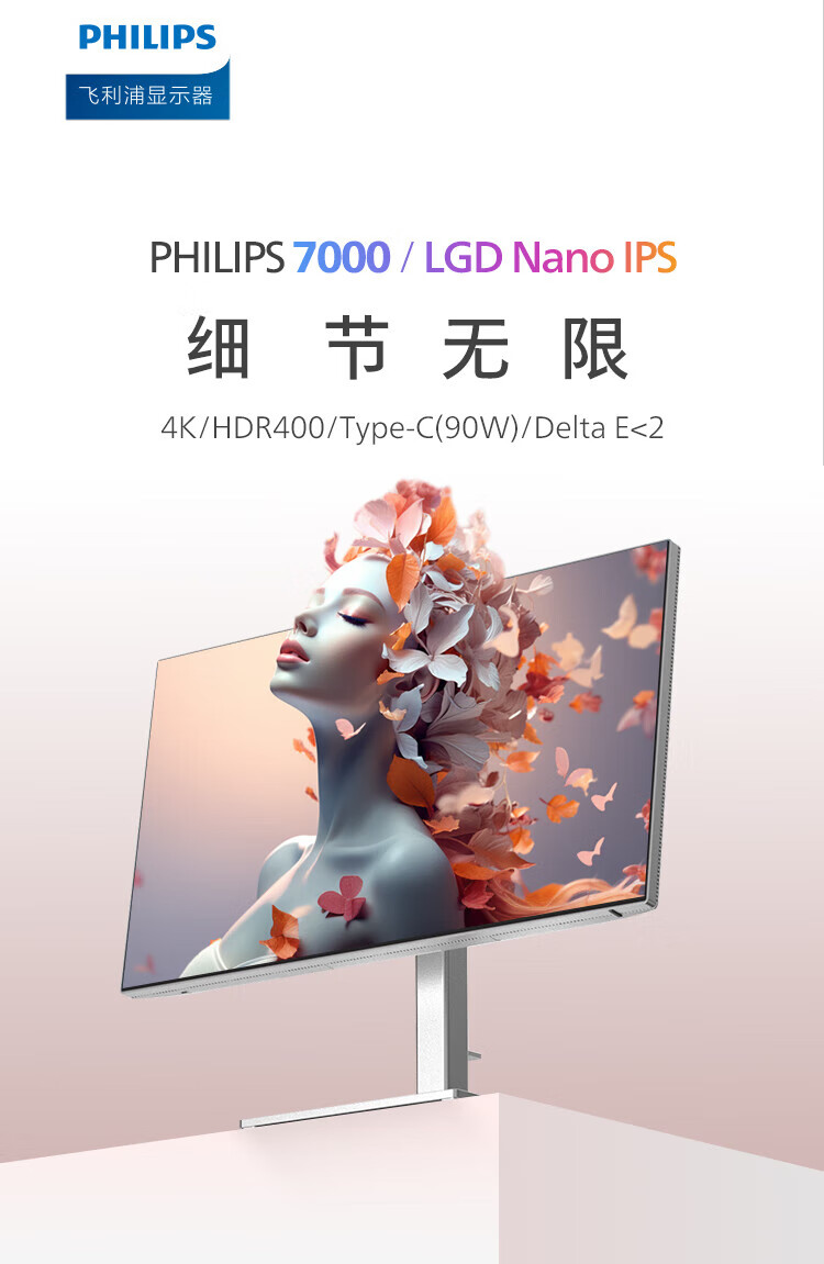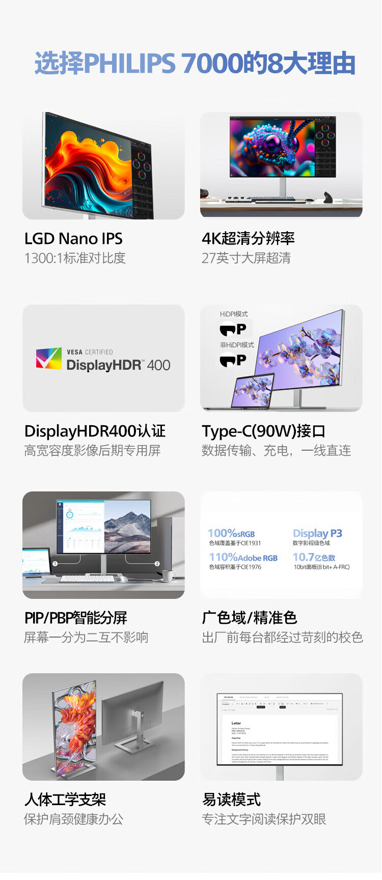 Philips 27-inch 4K NanoIPS TypeC90W Professional Color Accurate 10bit HDR400 Slim Full Screen Lift and Rotate Design Office Monitor 27E2F7900
