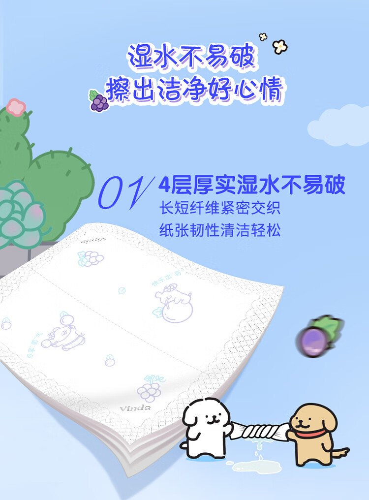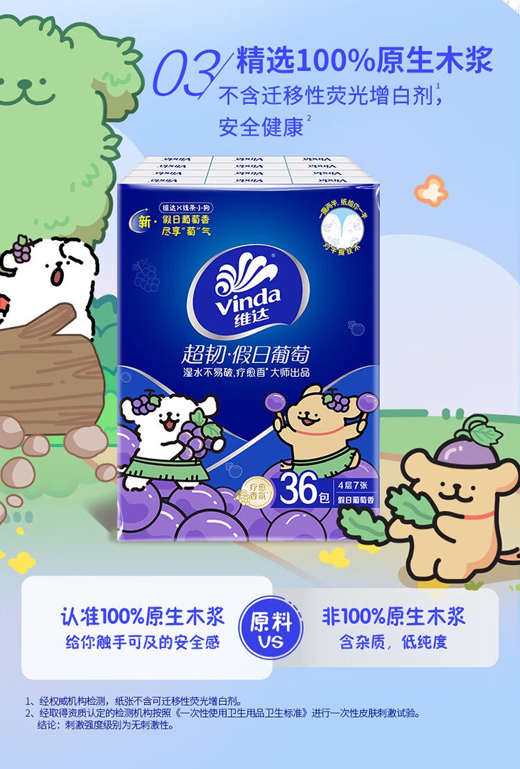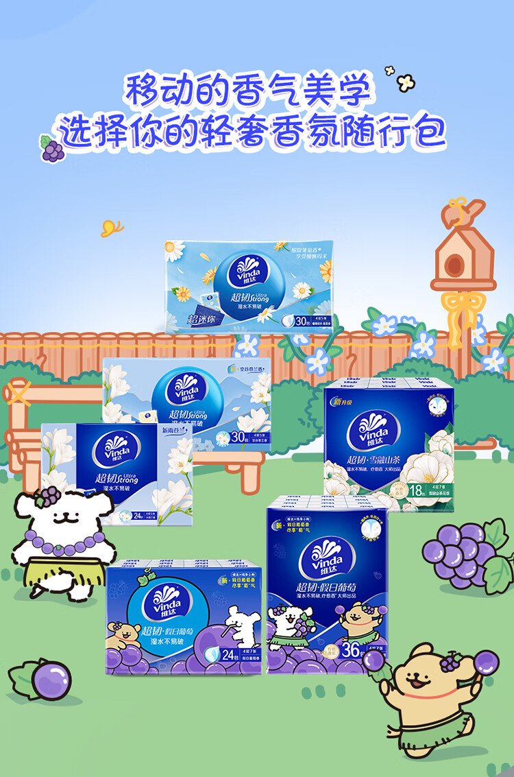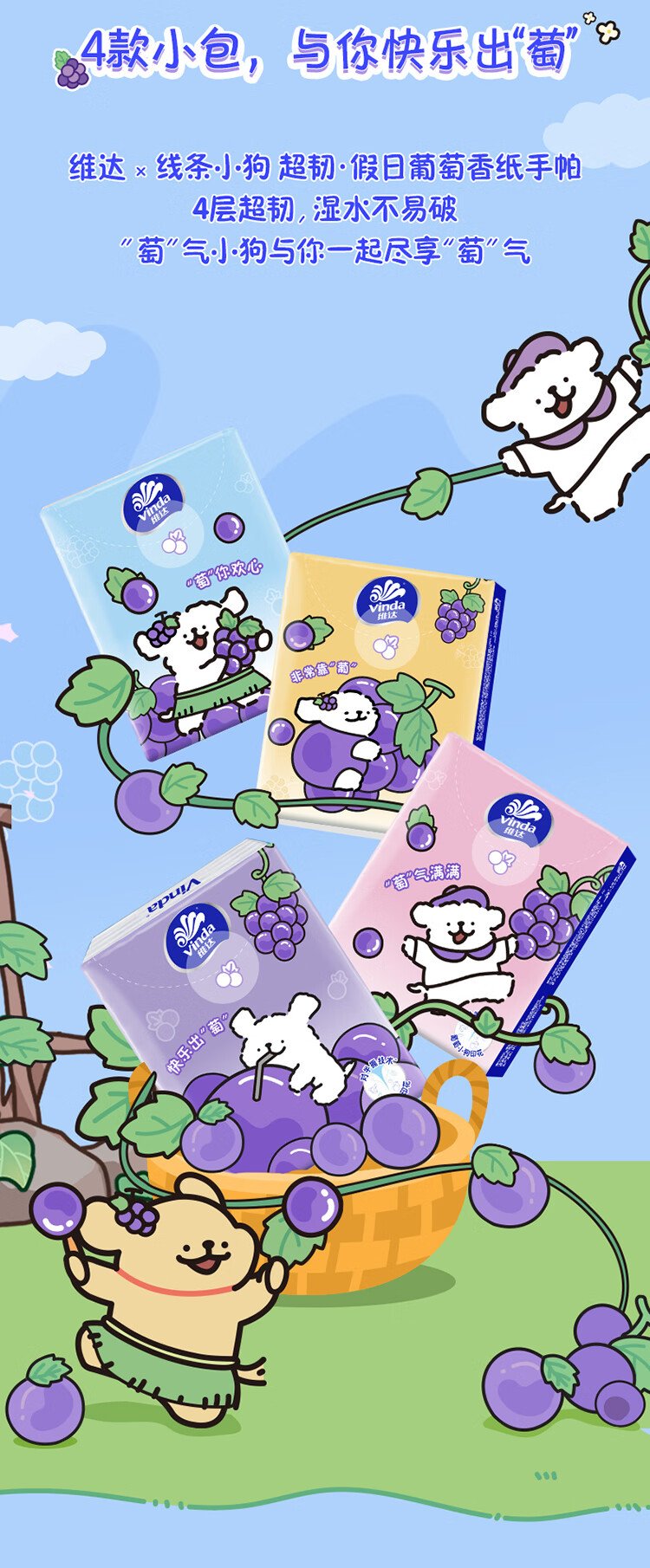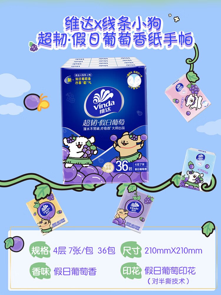 Vinda x line puppy super tough grape scented handkerchief paper 4 layers 7 sheets 36 pack not easy to break when wet thickened paper towels