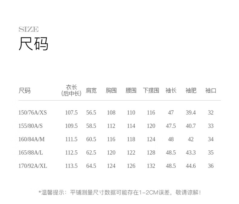 China (cm) 160-165/84-86 165-170 / 88-90 167-172 / 92-96 168-173 / 98-102 170-176 / 106-110