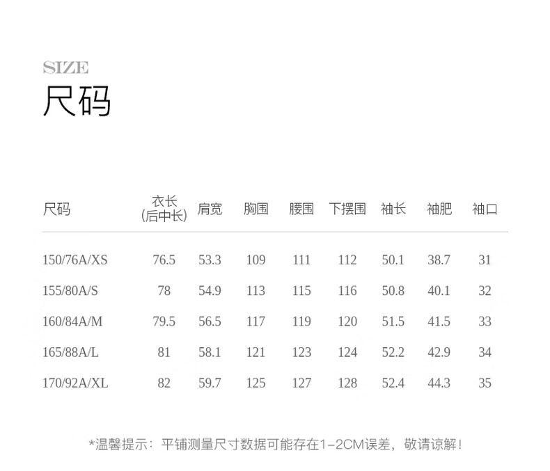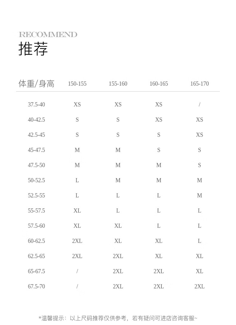 China (cm) 160-165/84-86 165-170 / 88-90 167-172 / 92-96 168-173 / 98-102 170-176 / 106-110
