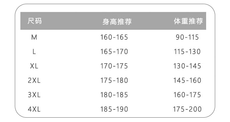China (cm) 165 / 88-90 170 / 96-98 175 / 108-110 180 / 118-122 185 / 126-130